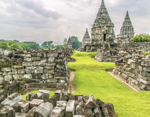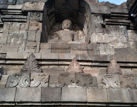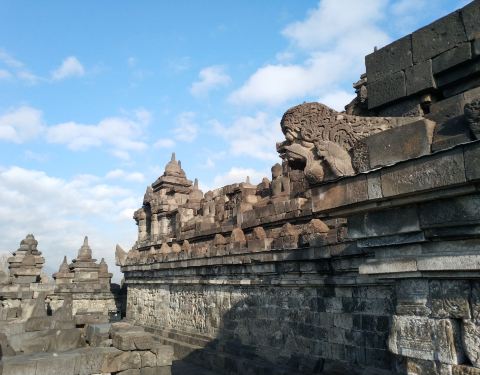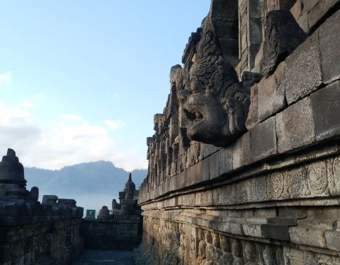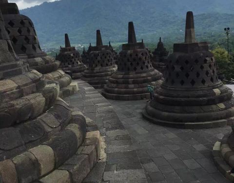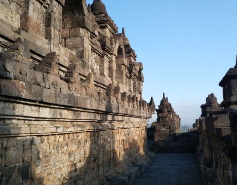 婆罗浮屠位于日惹西北约40公里处,是世界上面积非常大的佛教建筑群遗迹,被列入了世界文化遗产。婆罗浮屠意为“山丘上的佛塔”,但是谁为何而建并无文字记录,十分神秘。 来到婆罗浮屠大佛塔前,你一定会被它所震撼。这座大佛塔以当地火山岩建造,塔身分为10层,由6个庞大的方形平台、3个圆形平台及中间圆顶组成,基座长达百余米,总高40多米,相当雄伟壮观。 佛塔上有2600多块浮雕和500多座佛像,顺着台阶爬上去可以细细观赏一番。每一层的回廊石壁上全是栩栩如生的浮雕,雕工细致精美,图案千姿百态,有的描绘着佛经故事,有的生动地反映着人民的日常生活及各类牲畜、花鸟鱼虫等。大大小小的佛像,神情姿态也是迥然各异,足以看上好些时间。 爬到顶端,可以看到中间的尖头圆顶,它被70余座端坐在镂空舍利塔里的佛像所包围,场面十分令人敬畏。你可以透过镂空的舍利塔看到里面的佛像,也有少数佛像半露在外头,比人还高大,格外吸引眼球。天气晴好时,站在佛塔顶端可以眺望到默拉皮火山,而这些坐着的佛像,似乎也在和你一样凝望远方,很有意境。 婆罗浮屠也是看日出的好地方,很多人专程于清晨寂静之时,在此等待太阳升起、阳光映照佛塔和佛像的时刻,景色安宁而壮美,撼动人心。