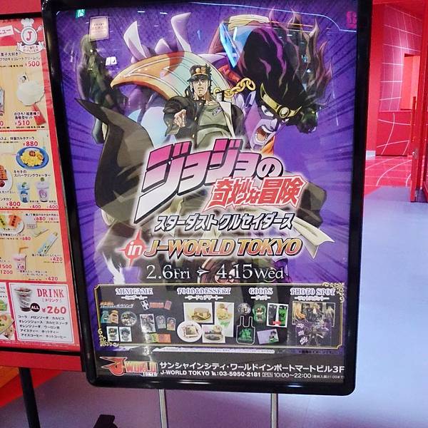 其实很好找,商场内都是有指引的 Jworld有门票和通票2种,通票在里面玩几个游乐项目,门票就只是入场而已 反正我的目标是里面的JOJO CAFE(又是吃……)所以就只买了入场券,800一人哦 真是JUMP厨的天堂啊啊啊入口处太子带你飞~好想要这个塔罗牌的夹子_(:з」∠)_布景~壮哉大酱铺! OP不愧是OP啊,足足占了近一半的面积,听说在东京塔那现在有OP主题的游艺项目,喜欢的可以2个一起去(虽然我没看过OP(笑