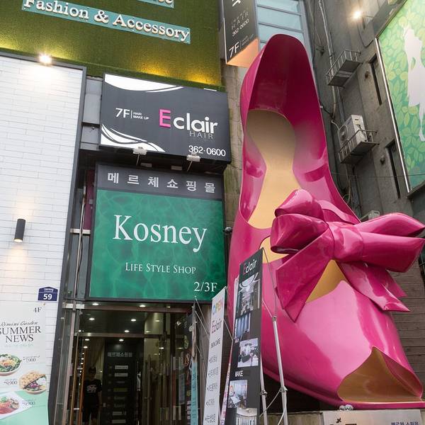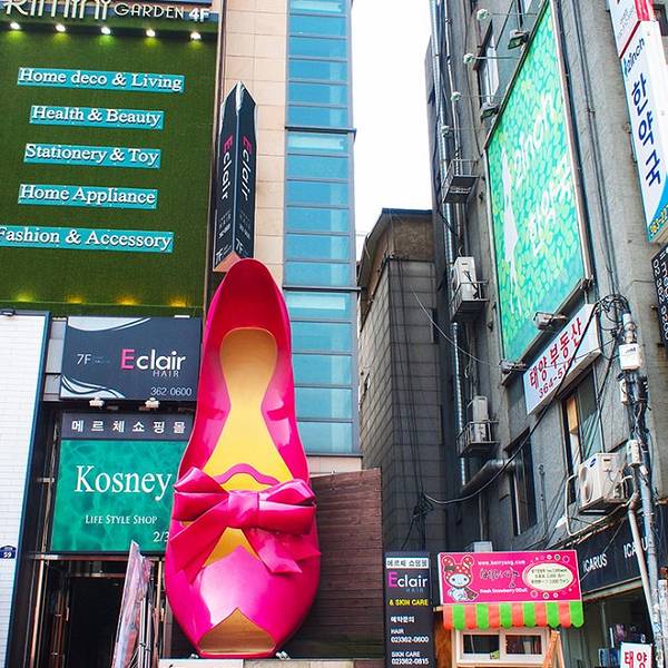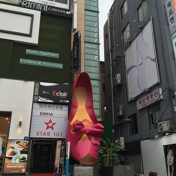 吃完饭,可以到梨大旁边知名的女人街逛逛,除了知名的巨型粉色高跟鞋,这里还有挺多化妆品店、首饰店、服饰店,值得淘买一番。