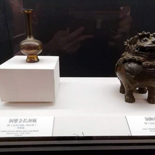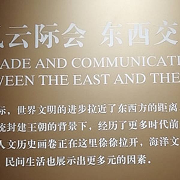 “永远长生供养,祈保西洋回往平安,吉祥如意者。大明宣德六年岁次辛亥仲夏吉日,太监郑和、王景弘等同官军人等,发心铸造铜钟一口。”仿制品铜鎏金长颈瓶、铜狮形熏炉乾隆54年铭琉球墓碑外销瓷外销瓷漳州窑明德化窑暗花衬莲花纹觚