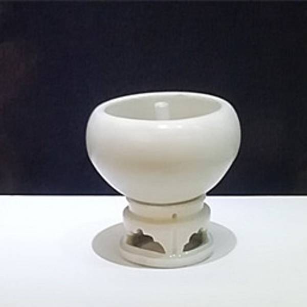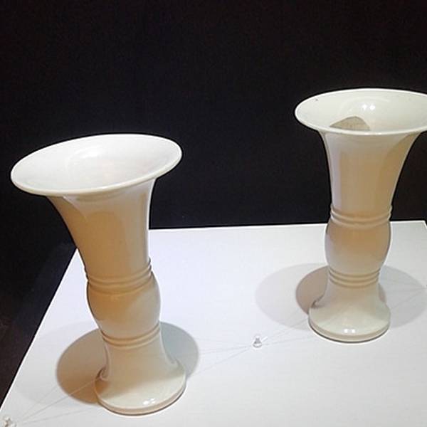 喇叭口,长颈,微鼓腹,高圈足外撇。腹上下各饰二圈凸弦纹,腹中印暗花衬莲纹。底露白胎,釉色牙黄。德化白瓷 展开