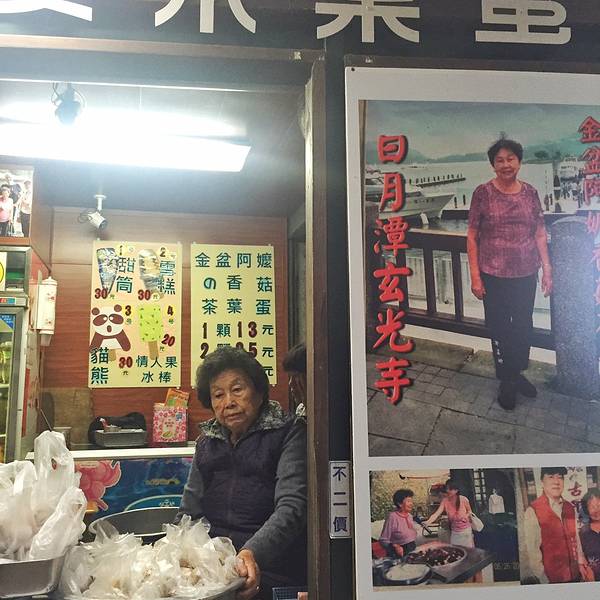 茶叶蛋到处有,不过这里的茶叶蛋特别香,因为用了别处吃不到的阿婆独门秘方:日月潭名产阿萨姆茶叶和加了香菇!【概述】日月潭的邹金盆阿嬷在日月潭玄光寺码头卖古早味香菇茶叶蛋50年,从少女茶叶蛋西施卖成了阿...茶叶蛋到处有,不过这里的茶叶蛋特别香,因为用了别处吃不到的阿婆独门秘方:日月潭名产阿萨姆茶叶和加了香菇!【概述】日月潭的邹金盆阿嬷在日月潭玄光寺码头卖古早味香菇茶叶蛋50年,从少女茶叶蛋西施卖成了阿婆,经久不衰。【地理位置和交通】位于日月潭玄光寺码头通往玄光寺的阶梯上,日月潭游船会停靠3个码头:水社、玄光寺、伊达邵。玄光寺码头下船后,就能看到阿婆茶叶蛋的摊位。【环境】阿婆茶叶蛋的店食物是外带的,店里没有座位。所以你在日月潭游船的时候,经常会看到游客带着茶叶蛋。店里有邹金盆阿嬷的照片作为宣传。【菜品和口味】这家的茶叶蛋和别家的味道的确不同,是利用日月潭附近的名产阿萨姆红茶,香菇,灵芝一起煮的,咸淡适中,非常好吃。从茶叶蛋的蛋壳就可一眼看出茶叶蛋煮得十分入味,蛋里面还可以吃到有淡淡清香的香菇味道。【价格】茶叶蛋1颗13台币,2颗25台币,4颗50台币。因为刚吃完午饭,所以我们2个人只买了2颗尝尝,才5元人民币。听闻台湾新闻说大陆同胞吃不起茶叶蛋,还以为台湾茶叶蛋有多贵,和国内差不多嘛。【服务】买茶叶蛋的人非常多,大排长龙啊,前面大概排了有10多个人,不过茶叶蛋都是已经煮好的,用袋子装一下就行了,所以没有等很久。