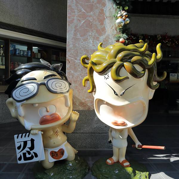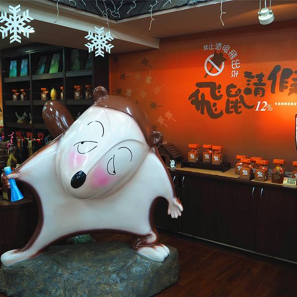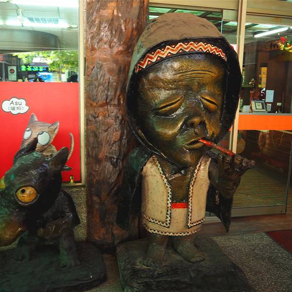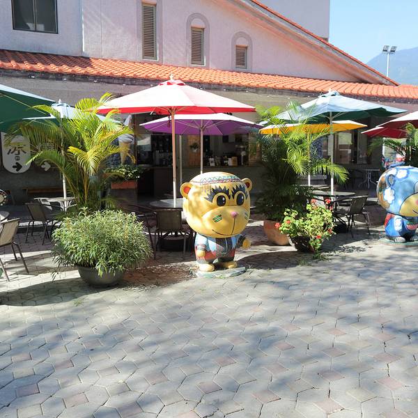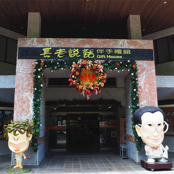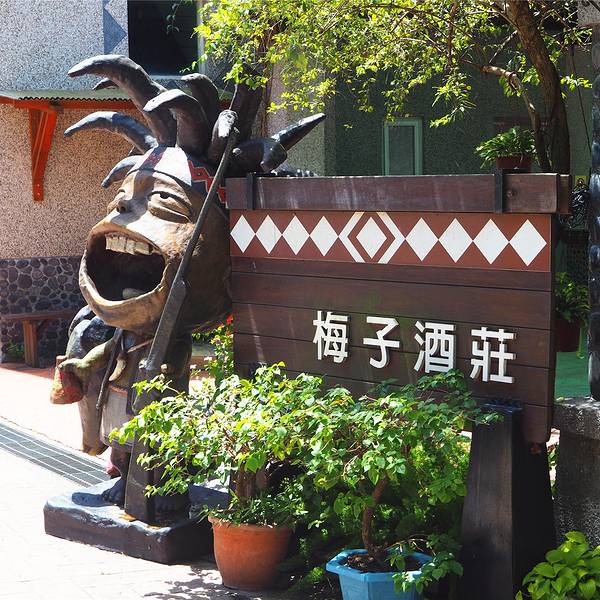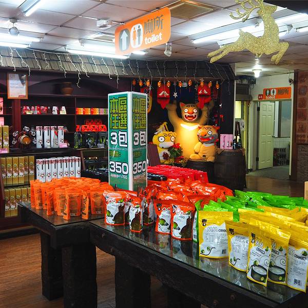 从阿里山拼车到日月潭的路上会走新中横公路,这是一条非常危险的公路,一路上常常看到落石断路,每天夜间公路还会关闭。我们中途在信义乡的梅子酒庄停靠了一段时间休息方便,当然也是希望我们能够在这里购物的。这里虽说名为酒庄,其实销售的商品远远不止酒类,可能因为当地的梅子酒比较出名取名酒庄吧。伴手礼店与酒庄相联通的是一家名为长老说话的伴手礼店,门前的人物造型很卡通。这里的商品基本都是梅子的衍生品,梅子酒和梅子糖都是这里的主打,我们散称了一些梅子糖,发现价格似乎比大陆超市的还要便宜。当地的小瓶梅子酒文创系列摆件