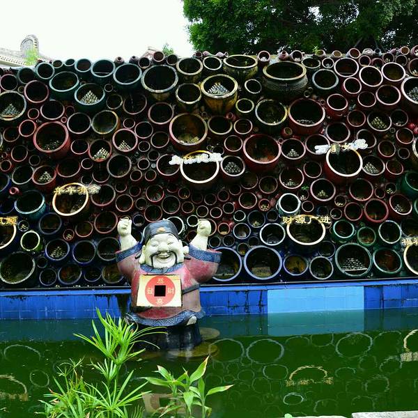 大缸瀑布,其实它是在园区外面的,也就是说,不用买门票也可以看到。眼前大缸的颜色主要有红色、绿色和黄色,以红色调为主,寓意着红红火火,实际上,这里是有365个颜色各异的大缸,喷泉流下的池中央一个聚宝盆,暗示着盆满钵满的意思。