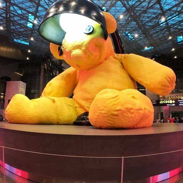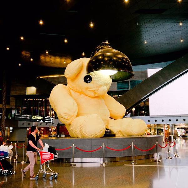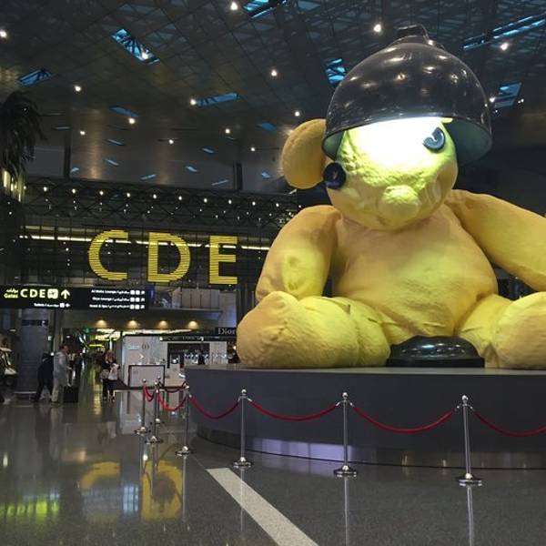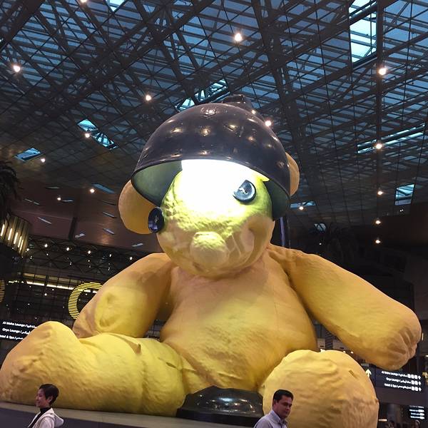 - 多哈机场标志性塑像-大黄熊。多哈机场很大,感觉是富丽堂皇,空调很足。多哈机场留影。多哈机场。多哈机场