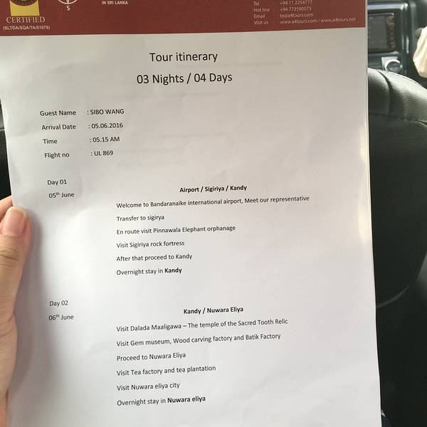6月4日晚上,三人组在机场汇合,踏上旅程。这次是乘坐的斯里兰卡航空,餐食和服务都还不错,座位也蛮舒适,就是冷气很冷,但会发毯子。飞行时间七个半小时,经过一夜的航行,我们在斯里兰卡时间清晨五点多准时到达科伦坡班达拉奈克国际机场。之后就是入关,入关后有几家免税店可以购物。再往外走就是拿行李的地方。拿完行李往外走就能看到一排换钱的柜台,当时和美金的汇率是1:145,每家柜台都一样,我们就随便找了家。 一从到达口出来,就看到了举着我名字的接机大叔,热情寒暄后,他先帮我们办理了电话卡。在机场到达大厅里面有好几家卖电话卡的,但大家基本都会选择Dialog(据说这个品牌是信号覆盖最广、服务最好),排队的人也非常多,全程是接机大叔帮我们办理的,很贴心。我们的套餐是1300Rs,含有9G流量+40分钟国际长途+50分钟本地通话。除了在高山火车上,霍顿平原和雅拉公园没有信号以外,其他地方信号都不错,网速也挺快。 其他几家的柜台完全没有人,看了下套餐的价格和内容也都差不多,如果不想排队的话也可以试试。接机大叔带我们走出机场,车已经在外面等我们了。上车见到了司机Riran,他就是我们未来四天的司机兼导游了。下图是包车公司按照我们给的路线安排的行程,如果有什么要求和变化,也都可以跟司机商量,他会尽可能满足我们的所有需求。