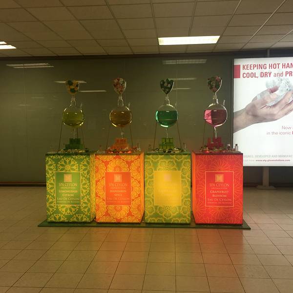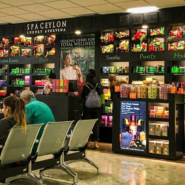 三月份的时候,科伦坡机场在改造,机场的开放时间做了限定。我们原本早上8点的飞机,但是要求提前五小时到机场,不然就进不去了。大半夜蓬头垢面睡眼惺忪的去了机场 机场安检处,简陋的简直不像话。关键照明系统还坏了黑灯瞎火,简直大开眼见!机场例行表演机场SAP CEYLON专柜,如果可以的话,建议在城区专柜买,机场价格不划算