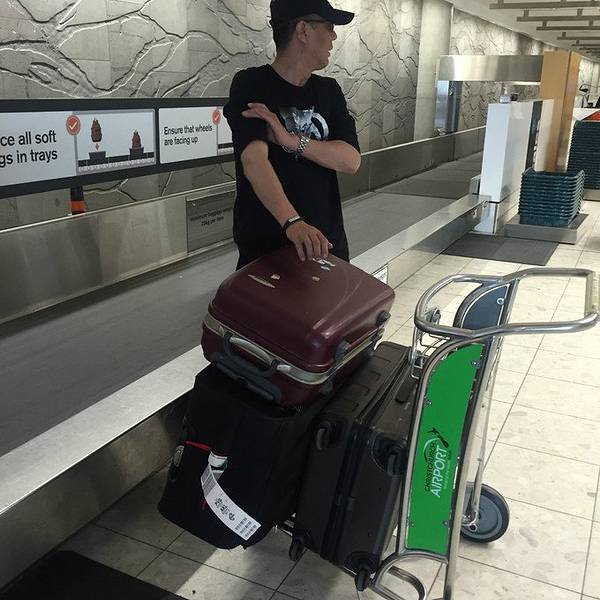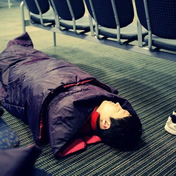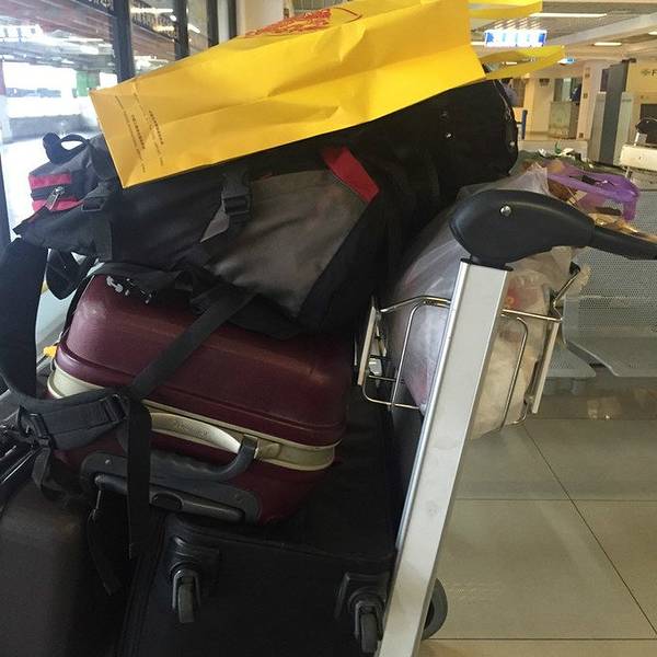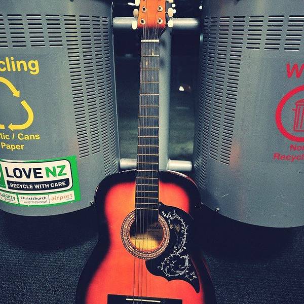 本来打算地铺过夜的我们由于太兴奋而没法入睡,把机场内外兜了个遍,这里有很多和我们一样地铺过夜的人们,越来越临近天亮走的人越来越多,在垃圾箱附近发现了一把别人不要的吉他~ 我们把它捡回来玩