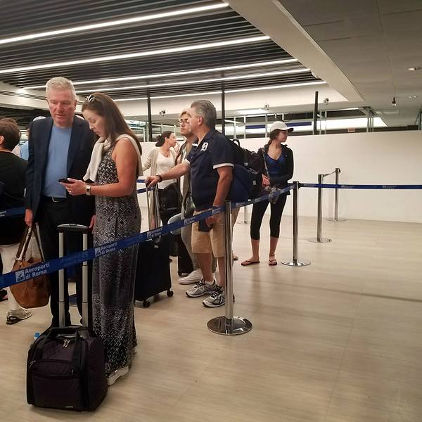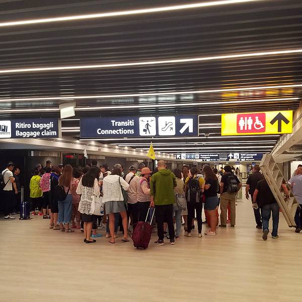 看不见队伍的源头,几乎要从进门处开始排队,仿佛看到了曾经还不能...飞越9000多公里,在飞机上见证了新一天的开始,飞机清晨7点多便降落菲乌米奇诺机场。