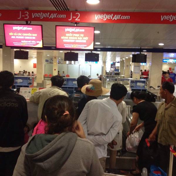 152路去机场就在之前下车的地方的对面坐车,票价依然是5k,整个车程也差不多是40分钟左右。新山国际机场的航站楼分两个,一个是国际,一个是国内。152路在机场是停靠在国际的那个航站楼,所以,要飞越南国内段的小伙伴们,下车还要自己往前走一段,到另一个航站楼。 我下车的时候就没注意这些,在国际航站楼瞎转悠了一大圈,找不到我办理值机柜台的地方,咨询了工作人员才搞定的,紧紧张张的跑到了捷星太平洋航空的值机柜台。这次我可是准备好了,我的票号的,可惜这次比较方便,给了她护照就帮我办理好了登机牌,同样也是很薄的纸质登机牌,真心觉得这样很好。本来想选第一排的座位的,因为第一排比较宽敞,结果要交80k的费用。其实也不贵,就人民币24块钱左右,但是想想我的机票才119元,还是算了吧!反正就1小时的航程。
