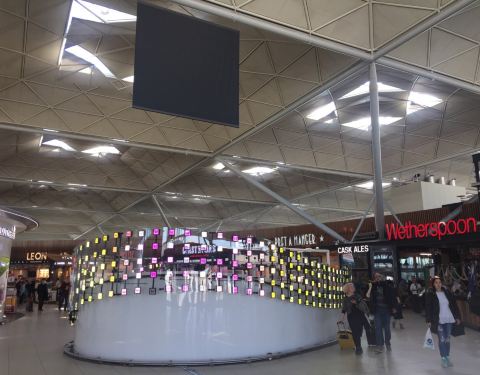 伦敦第三大机场,有大巴和火车连接城市中心。建筑风格很简洁,航站楼之间有小型轨道车转运旅客。值机、安检的效率很高,候机楼内外都有不少的商业店铺,做什么都比较方便。