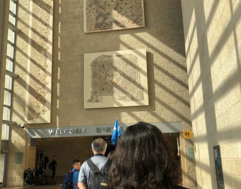 特拉维夫国际机场,宏达有历史和民族的特色,巨大的休息大厅很多人在这里吃喝休闲,墙上的马赛克特别漂亮。在机场最外层用美元换到了花花绿绿的谢克尔,真好看。以色列物价贵