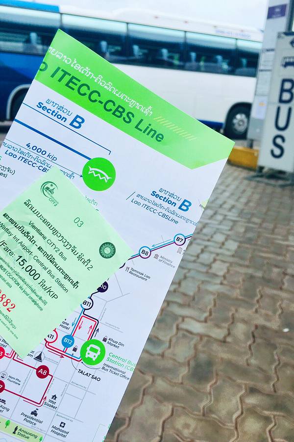 还是一个人一个包,还是那只背了近10年的50L背包。 前几年还会带一只低配的单反,现在不带了。机场大巴服务区 (看过几篇老挝的游记,都说老挝机场没有大巴,只有Taxi和TuTu。) 到达出口有服务中心,中心有大巴票卖,服务员很热情,我给他看了网订的酒店地址,他就帮我选了A6线的票。 出候机楼大门往右前走几步,就是大巴候车区。 大巴车上有售票员,可以上车买票,售票员也很热情,到站时还特地走到我身边,轻声提醒我下车。非常好的感受。机场大巴 座位很舒服