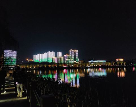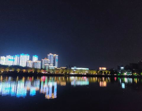 下榻九江远洲国际大酒店,南湖公园就在窗外。入夜,霓虹灯的倒影把南湖公园点缀得如同热闹的都市