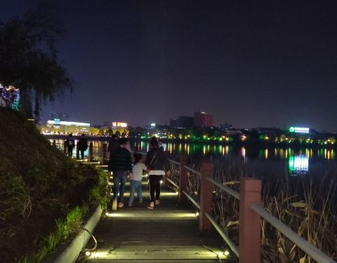 下榻九江远洲国际大酒店,南湖公园就在窗外。白日,烟波浩淼。入夜,霓虹灯的倒影把南湖公园点缀得如同热闹的都市。沿着南湖公园散步,步行可以到达九江火车站。