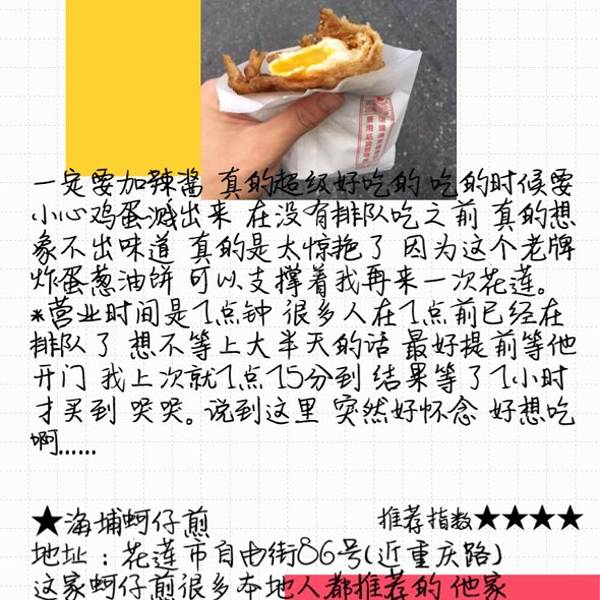 地址:花莲市复兴街102号 推荐指数:9.8 花莲市的招牌美食,大陆绝对吃不到的口感。下午1点开始卖完为止,排队30分钟左右。脆香的葱油饼裹上特质酱油,将半熟的煎蛋包裹其中,咬下去蛋香和酱香就爆炸在口中,吃了...