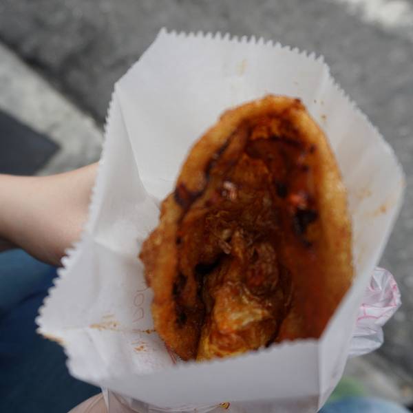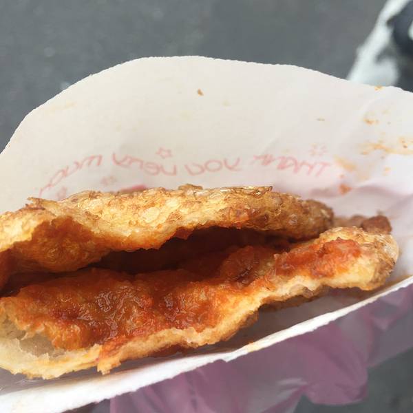 入住的青旅要3点才能入住 趁着这个空档 我们就决定去吃老牌炸蛋葱油饼 没想到那么热的天气 真的很多人诶 拿了号等了大概大半个钟就到手啦 一句话 “无得弹” 超好吃 这个要加辣酱!!!酱料很浓郁