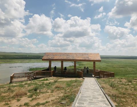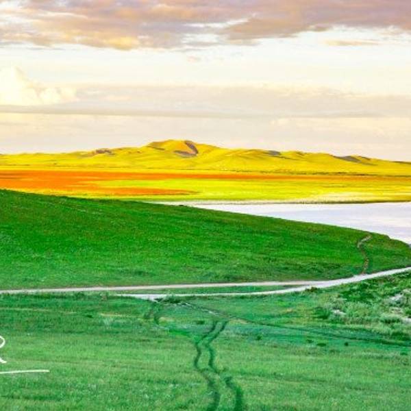 同伴说这里人很少,也安静,你看你的风景,我来抓拍几张照片,如此贴心的摄影师真的令人感动第一站我们直奔九曲湾景区,当时法国导演让·雅克·阿诺选了这里作为拍摄地,并且在电影中说到这里是中国最后一片未被开发的原始草原,可见这里的草原是多么美。游客中心买票进入景区,发现来这里的游客很多,门...第一站我们直奔九曲湾景区,当时法国导演让·雅克·阿诺选了这里作为拍摄地,并且在电影中说到这里是中国最后一片未被开发的原始草原,可见这里的草原是多么美。游客中心买票进入景区,发现来这里的游客很多,门口还有滑翔体验,和元上都遗址的很像,这种项目应该是分季节性的,只在夏天来草原时才能体验到,滑翔时间不算长,价格200-300左右。乌拉盖草原土地总面积5013km2,可利用草场面积650万亩,占总面积的87%,是世界上天然草原自然风貌保存完好的黄金牧场之一,拥有草本植物500多种,动物种类繁多,有黄羊、旱獭、狼、仙鹤、天鹅、大雁、黄羊等数十种野生动物,是中国典型草甸草原旅游休闲胜地。往景区里做一段路后就到了游览车的乘车站点,因为中午比较晒,所以建议大家来的时候还是要购买电频车票,不然需要走很长一段路。关于这里的历史,相传成吉思汗夫妻曾来到锡林河畔登高俯瞅,牛羊撒落,百鸟低旋,景色迷人。成吉思汗和妻子被美丽的景色吸引,双双纵马奔驰。奔驰中,妻子的围巾不慎飘落在草地上,而他们则全然不知。当他们回头望去时,围巾将直流的锡林河变成了九十九道弯,把草原装扮的分外美丽,成吉思汗有感而发:“此处造化神功,碧水青山,必成繁盛之地。几百年来,美丽的九曲弯,静静流淌在碧绿的草原上,常常勾起人们无限遐想,如今我终于站在了这片辽阔的天地间。电频车将我们带到了下车点,要到达山上的观景台还需要徒步一小段山路,好在不算太陡,沿途有应接不暇的风景,也就不觉得累了很多人提起草原,第一反应就是呼伦贝尔,毕竟那里名声在外,而当我来到这里,看到眼前这壮美的景色时,真的可以毫不夸张地说,中国最美的草原,最原生态的草原是在乌拉盖,它没有辜负“天边草原”的美誉“。站在山顶,乌拉盖河蜿蜒曲折尽收眼底,似一条银色的哈达镶嵌在绿色的大地上,又因夏季的花海呈现出不同的色彩,这时候所有的语言都显得苍白无力,大自然的美唯有你置身其中才能体会,而那真实的感受,很多时候又是只可意会不可言传的。草原绿草如茵,深呼吸一口,清香的草木味扑鼻而来,令人心旷神怡、如痴如醉。观景台上有很多游客在拍照,我找了一处人比较少的角落,只想安安静静地欣赏这辽阔无边的壮美景象。同伴说这里人很少,也安静,你看你的风景,我来抓拍几张照片,如此贴心的摄影师真的令人感动。一阵风吹来,草儿在风中翩翩起舞,此起彼伏,站在乌拉盖草原上,觉得自己也是一株草儿,穿着美丽的舞裙,在风中舞蹈。风吹草动,形成了一幅如诗如画的景象,仿佛进入了世外桃源。在山顶的观景平台休息了一会,那里还有小卖部,可以买到饮料和小吃,如果想要去更高的观景台,还必须往上爬,我和同伴表示爬不动了,就在前面那片草地拍拍照,买了个冷饮降降温。想和你一起去看草原上的日升日落.想和你一起在草原立尽斜阳.想和你一起观风起云涌.想和你一起默数天幕的星子.想和你一起沐浴淡淡的草原月色。想听你在草原中温柔的呢喃.想拾起你遗落在草原上的笑.想让草原的清新的风掀动我的长长的黑发,衣袂翩翩.想让你执我之手在草原漫步,无休无止…九曲湾景区的观景平台是无法进入草原深处的,也是为了保护草原考虑,不远处有围栏挡住了,即便如此,站在高处还是能够感受到这里是最接近“腾格里”的地方,眼前不断闪现出《狼图腾》电影中的情节,我想时隔两年,当我真正站在这里时,是时候将这部电影再重温一遍了。从九曲湾景区下来后,我们的向导也就是我之前和大家提到的小白,带着我们继续环湖游览,这时我们走进了乌拉盖草原,看到了弯弯曲曲的乌拉盖河。乌拉盖河是内蒙古第一大内陆河,发源于宝格达山西麓,由泉水汇集而成,水量稳定,全长达360公里。这里几乎是没有游客的,安静到能清楚地听到水流地声响我们瞬间跌入了童话般的仙境之中,无法自拔,走在木制的栈道上,一边是蜿蜒曲折的河段,另一边是无边的草原,绿草茵茵、野花丛生,香气袭人。同伴的灵感又来了,也是巧了,我今天正好穿了一件白裙,戴了顶草帽,特别应景,所以暂时客串了一把童话世界中的公主。大自然鬼斧神工,大伙沉醉于浑然天成的美妙画卷,迟迟不愿离去。这是一片神奇的土地,她有着朴实无华的纯真,有着宽容大度的豪爽,也有着宁静致远的深沉,多想时间就停在这一刻,让我能多做一秒钟的公主。草原上日落时间比较晚,一般都在6-7点钟左右,所以我们每天的晚饭都在8点之后,白天的时间很长,却仍觉得不够用,夕阳快西下时,我们来到金花滩的观景平台。自驾的好处是可以随时停车,想拍就拍,这点对于我们相当重要,这个观景平台就在路边,所以停下来呆上十几分钟再出发也不会影响到行程。每年的7-8月份,这里有成片的油菜花海,放眼望去,金灿灿的,这一路我们欣赏了太多的美景,一天下来,大家都像打了鸡血一样,完全不知道累,跑跳欢呼,此刻,所有的压力都抛到了九霄云外。旁晚我们在乌拉盖湖附近的蒙古包内吃饭,随后前往乌