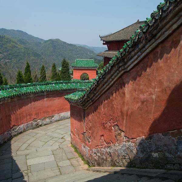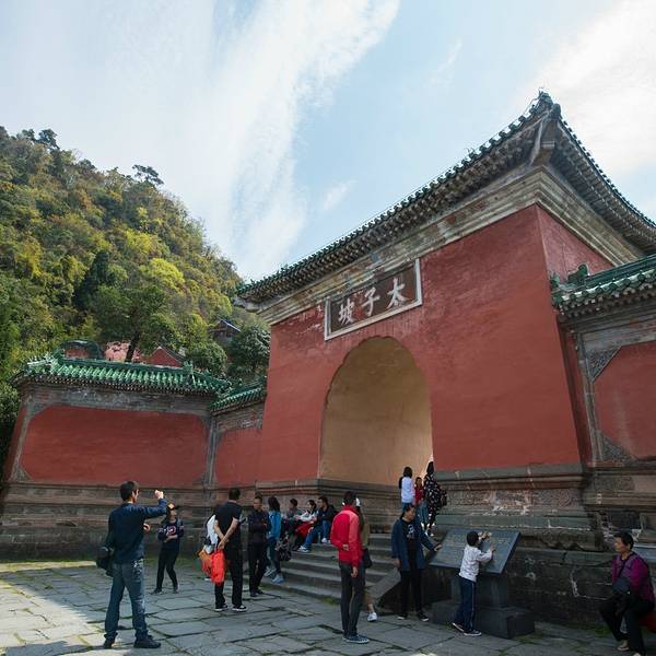 太子坡,又名复真观,位于武当山狮子峰60度的陡坡上,明永乐十年(公元1412年)修建,清康熙年间三度重修,现基本保持了当年的规模,是武当建筑群中的一个较大单元。传说中净乐国太子15岁时入山修道之初,就住在这山坡上。太子坡(复真观)建筑群包括复真桥、九曲黄河墙、龙虎殿、祖师殿、太子殿、五云楼等主要建筑。乘坐景区大巴到达太子坡的停车场后,迎面就是“复真桥”,过桥后的山门门楣上,砖雕的匾额刻着“太子坡”三个大字,这是明永乐十七年(1419年)驸马都尉沐昕亲笔题写的。走进山门,就是的武当山“九曲黄河墙”。在古道上,依山势起伏,建有七十多米长的红色夹墙,回转起伏,曲曲弯弯,犹如波浪起伏,弯曲高大的红墙,配上绿色琉璃瓦顶,无论从什么角度欣赏,都美感十足,体现出皇家建筑的气派和豪华。这里也是山中摄影迷们驻足流连的地方。在祖师殿(复真观大殿)中,你能欣赏到供奉的真武神像和侍从金童玉女。这一组巨大的塑像是武当山全山大的彩绘木雕像,约有600年的历史。而在太子坡(复真观)建筑群的高处,是明代建造的太子殿。殿内有真武少年(太子时代)读书的壁画、石案、笔墨、古籍等,所营造的刻苦读书的氛围,让人联想到当年太子生活学习的艰辛。殿内还供奉有铜铸太子读书像,这里也是武当山求学祈福之地,每年都有考生或父母来这里敬香祈福。如果你是古建迷,那么你在太子坡一定不能错过五云楼。太子坡的五云楼,也叫五层楼,高约15米,是现存武当山高的木构建筑。五云楼采用了传统的营造工艺,墙体、隔间、门窗都是木质结构。五云楼值得看的是顶层的“一柱十二梁”:在一根主体立柱上,有十二根梁枋穿凿在上,这种构架,是古代木结构建筑的杰作。在太子坡游玩,你还能看到红军时期遗留下来的痕迹,如在观内照壁上写的“实行土地革命”、“红军是工农贫民的军队”等革命标语。