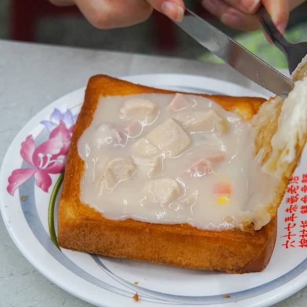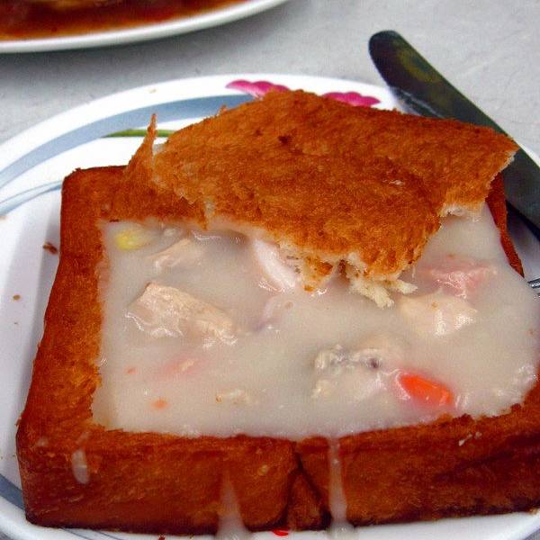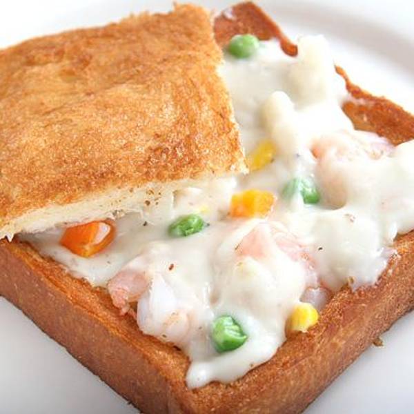 將炸的金黃酥脆的吐司倒入濃濃的濃湯就是最好吃的棺材板囉,另有各種口味可供選擇