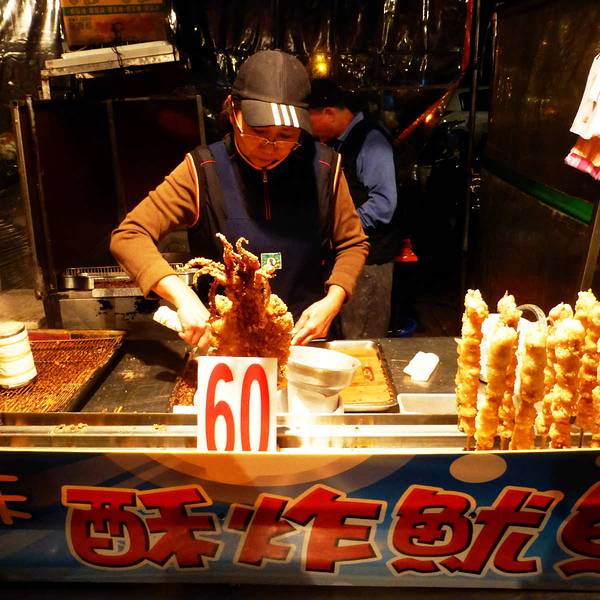 大东夜市更像是我们比较熟悉的夜市模式——所有摊位都摆在一个区域内,一排排美食摊子,可以逛很久。