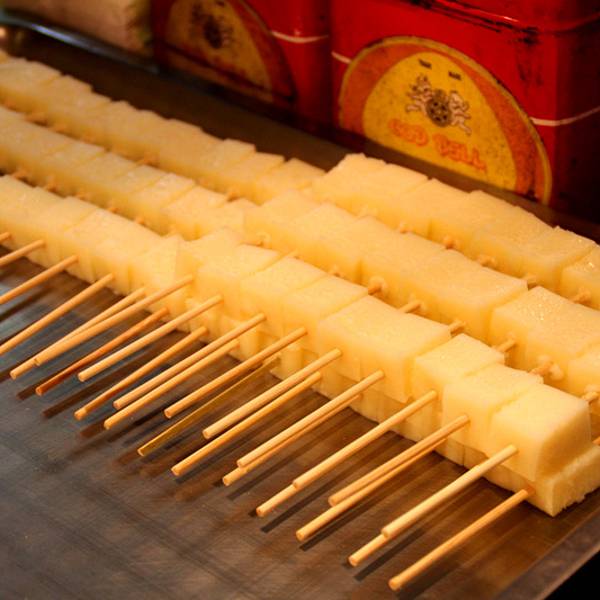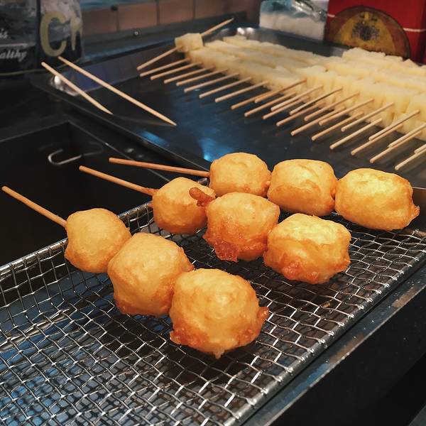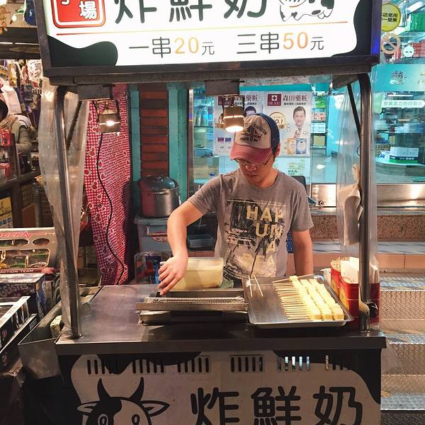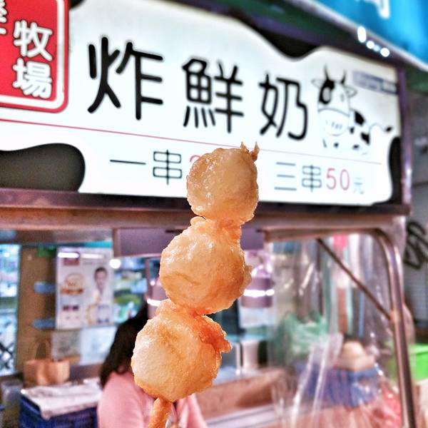 第四家:垦丁牧场炸鲜奶 炸鲜奶,自然还是胜在用的是货真价实的瑞穗牧场的鲜牛奶。一串20台币,上面有3颗,每颗都不算太大。我们买了三串,50台币。可神奇的是,老板穿串的时候用的是方形的牛奶快,下锅一炸,咔嚓就变成圆颗粒啦,哈哈。味道真的很不错,外面炸的苏苏脆脆的,里面的鲜奶咬开居然还会流出来!!!不过,吃到后面确实稍微感觉有些腻。