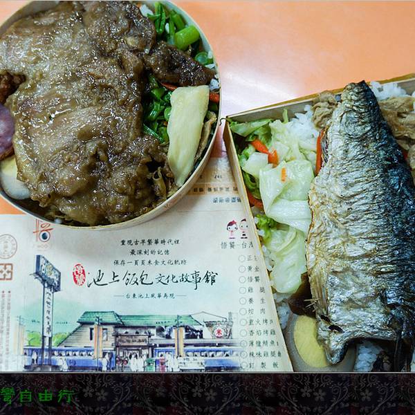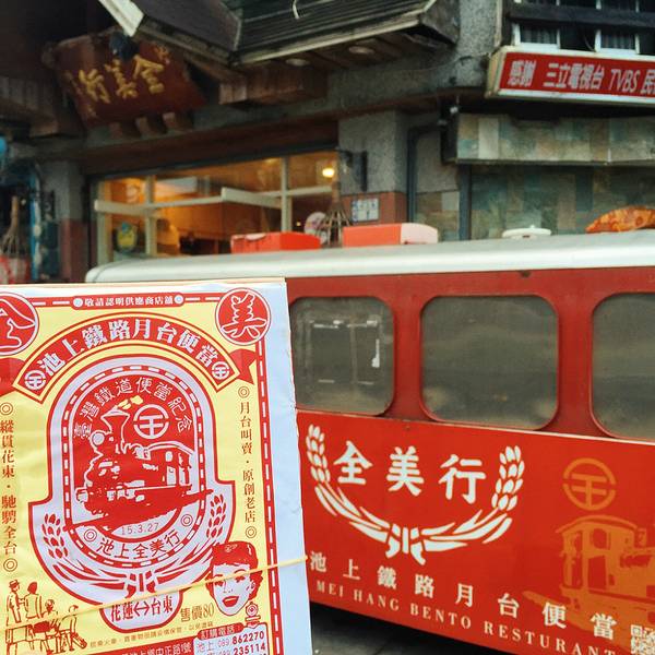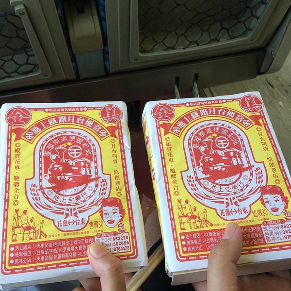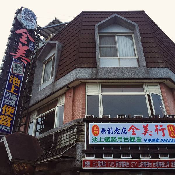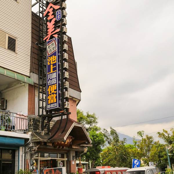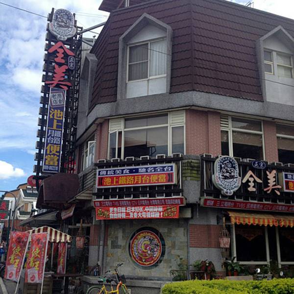 全美行池上便当,多年以来,都取得池上车站贩卖月台便当的经营权,从早上第一班火车经过时,就开始卖了,也就是当你不管坐任何一班火车,只要有停池上,都可以买的到全美行的池上便当。也可以到店里吃,在车站右手边。这在台湾所有便当里最有特色的一家,便当内的菜品感觉有十几样之多,虽然每种只有一块,凑在一起真是意犹未尽呢。