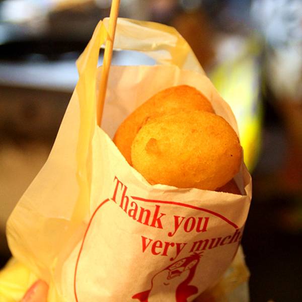 地瓜球丢进锅里炸的时候还是长长方方的圆柱体,炸好之后膨胀了好多倍。摊子在夜市靠近小湾的那一区域