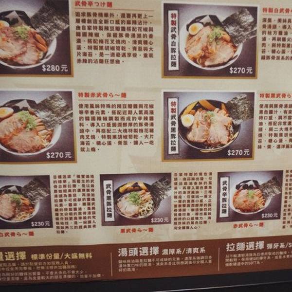 我们四个在车上昏睡,正午便抵达左营站。饥肠辘辘的我们,又开始觅食啦~!拖着行李到3F,有家拉面馆排着长龙,原来是日本有名的拉面连锁店”麵屋武藏“。它在台湾有五家分店咯,高雄的这家是武骨店。每家店的装饰风格都不尽相同,主打招牌及面种也不同,面可选Q弹或偏软,汤头可选浓郁或清淡,名片还融入神社鸟居,创意十足啊!五家分店的名片,内里有各店的产品。店门外的介绍,拍得有点糊,将就着看吧店内的装饰挺用心的由于我们要赶高铁,用餐时间只有十五分钟,那真是囫囵吞枣啊~~上菜! 武骨限定的黑雷拉面,特色的黑色汤汁,扬童鞋说超赞!我点的一乘寺太刀拉面,最贵,380台币!呜呜,为了赶高铁,都没吃完~~汤头很正! 花了这么大篇幅来说这家拉面馆,原因在于它的用心:菜单用心,装潢用心,服务用心。当我在香港屯门找到这家店时,以为能够弥补在高雄的遗憾,结果,面和汤头不提供选择,只有一种; 服务态度差,肉的质感也完全不同。和一般的日式拉面馆毫无差别。如果香港的朋友看到,不要喷我,这是事实。因为有了对比,才会如此失落。