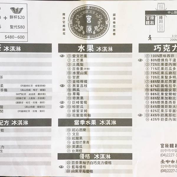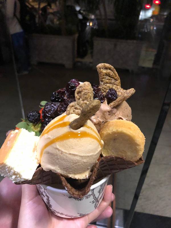 地理位置的话:从台中车站出来过一条马路,一直走,5分钟就到了。开着Google导航过去非常准确,招牌也很大,找起来不难。不同口味的冰淇淋,话说我一共尝了6个球,很多口味我个人觉得区别并不大。冰淇淋上放的小点心冰淇淋论球卖,为了尝到更多的不同的味道,我跟老头每人买了一个三球的……不过真心的奉劝大家,像上边图里的三球冰淇淋,两个人一个已经够了,实在是太大了……或者适当的减减球数……
