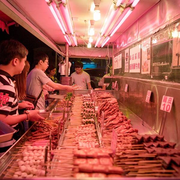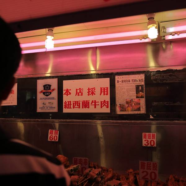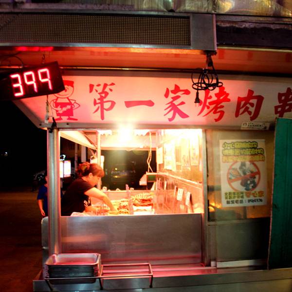 第一家烤肉串,算是自强夜市的地标。如果假日期间据说摊前LED灯还会打出“不耐久候者,请勿购买”。号码牌后也写着“我不是很有名,但是我已经很忙了,请不要为我打广告”,可见有多热门。据说选料、领号码牌、吃到热腾腾的烧烤,至少得花上一个小时。还好我们这次出行不是旺季,所以选好东西付款后就在周边随便走走,等看到显示自己的号码也就二十分钟的样子。 老板陈赐郎说烤肉好吃之秘,就是火候、酱料、食材新鲜;他的独门酱料有沙茶、酱油膏、麦芽及久熬的鳗鱼骨;为了这酱,研发数年,还倒掉几百公斤的试验酱,才成就今天的“第一家”。 “好酱”得来不易,除了不断尝试,还有陈赐郎13岁起从学徒到主厨的资历,他在18年前转做烧烤,跑过好几摊的夜市,7年前在自强夜市落脚,打出知名度。 一长排的烤肉摊,有4位师傅同时沾酱、翻烤,不太出奇的抽油烟机,据说是夜市首创的「环保机」,静电处理、不出油烟,这一台要价30多万,对夜市里每串10元起的烧烤摊来说,是笔不小的负担。 第一家最畅销的有:肉串、鸡皮、鸡屁股、甜不辣以及鱿鱼。