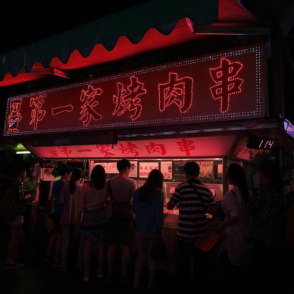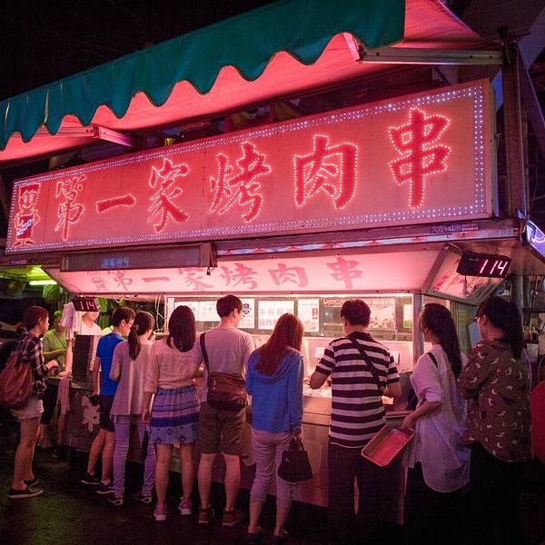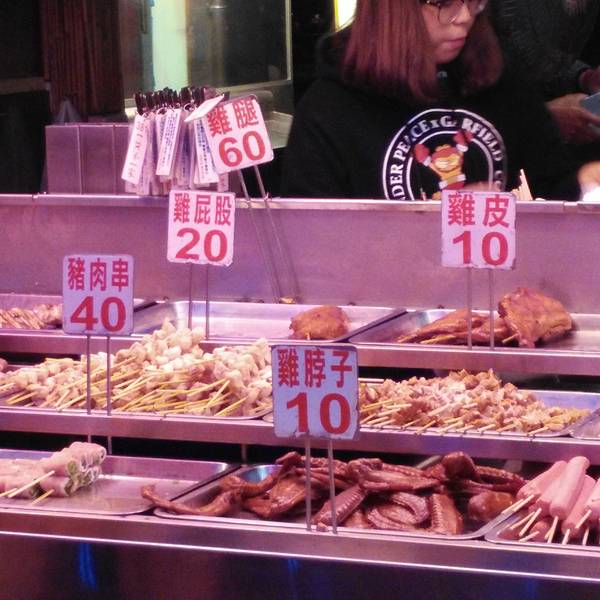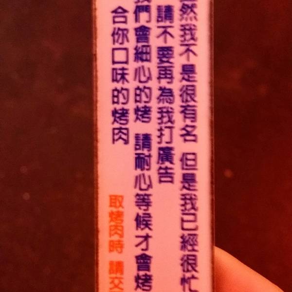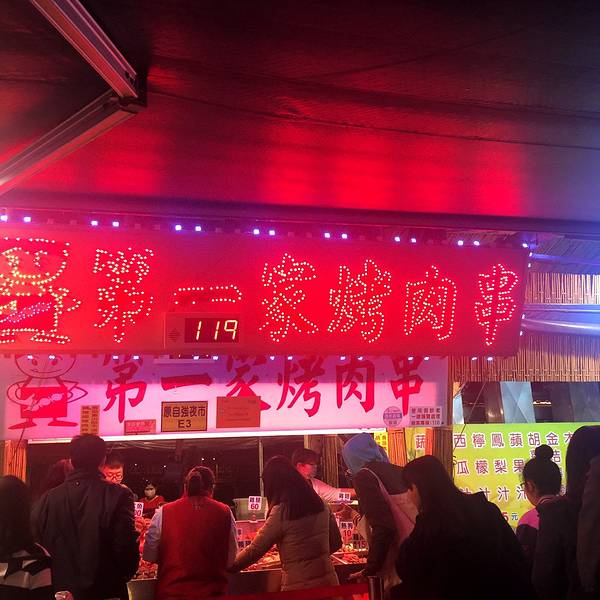 第一家烤肉串,算是自强夜市的地标。如果假日期间据说摊前LED灯还会打出“不耐久候者,请勿购买”。号码牌后也写着“我不是很有名,但是我已经很忙了,请不要为我打广告”,可见有多热门。据说选料、领号码牌、吃...第一家烤肉串,算是自强夜市的地标。如果假日期间据说摊前LED灯还会打出“不耐久候者,请勿购买”。号码牌后也写着“我不是很有名,但是我已经很忙了,请不要为我打广告”,可见有多热门。据说选料、领号码牌、吃到热腾腾的烧烤,至少得花上一个小时。还好我们这次出行不是旺季,所以选好东西付款后就在周边随便走走,等看到显示自己的号码也就二十分钟的样子。