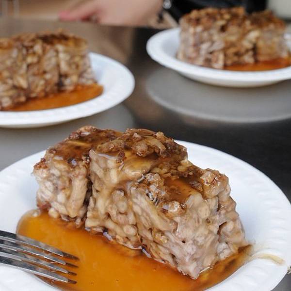 一整块儿塞了满满的芋头签,上面淋上特制的肉燥,蒸过的芋头不烂还挺硬的,有点像在吃芋头口味的沙琪玛