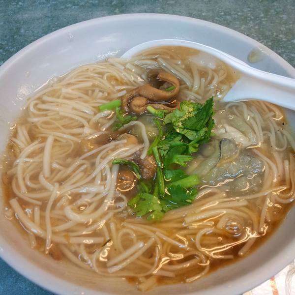 前一天试过水龙王鱿鱼羹,今天则和同事去隔壁客人挤满的“谢谢鱿鱼羹”试试看,看见其他桌都点了炒萝卜糕、蚵仔煎。 蚵仔面线(50元新台币)+珍珠奶茶(30元新台币)
