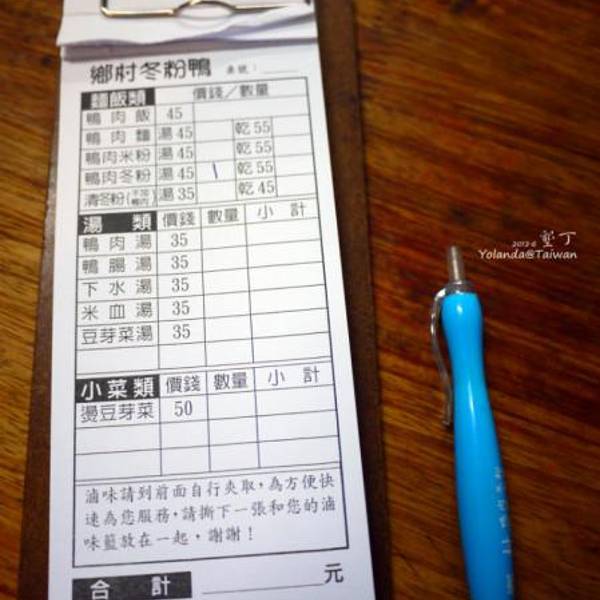 晚上去民宿老板推荐的鸭肉冬粉店吃饭~自助点餐,在单子上点自己想吃的东西,之后可以在橱窗挑选自己爱吃的卤味,连着单子放在盆子里面然后交给店员,然后就等吃吧~~