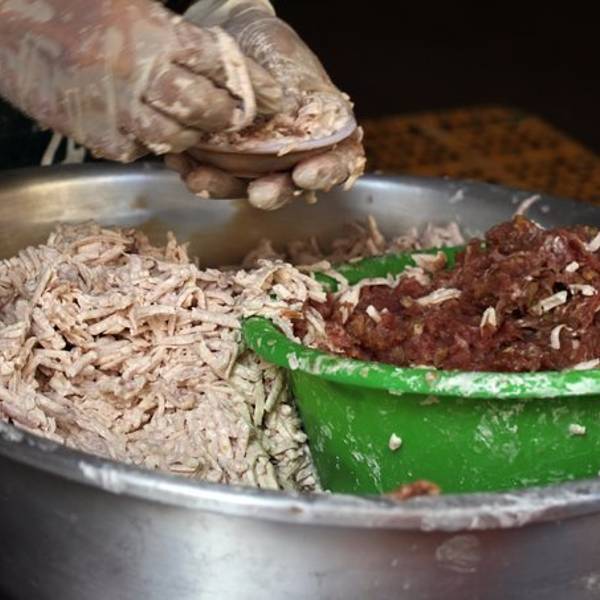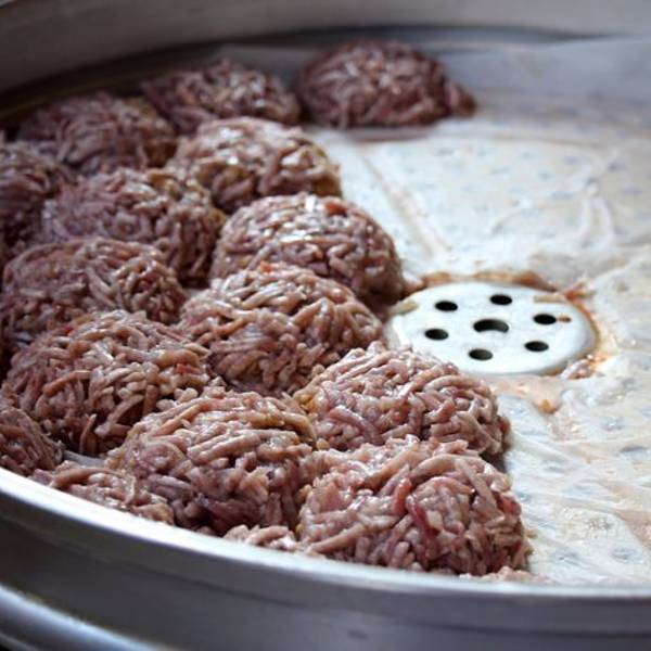 鹿港老街上现场制作的芋丸,用新鲜芋头磨成丝和肉馅一起蒸熟的。