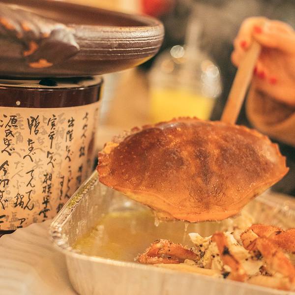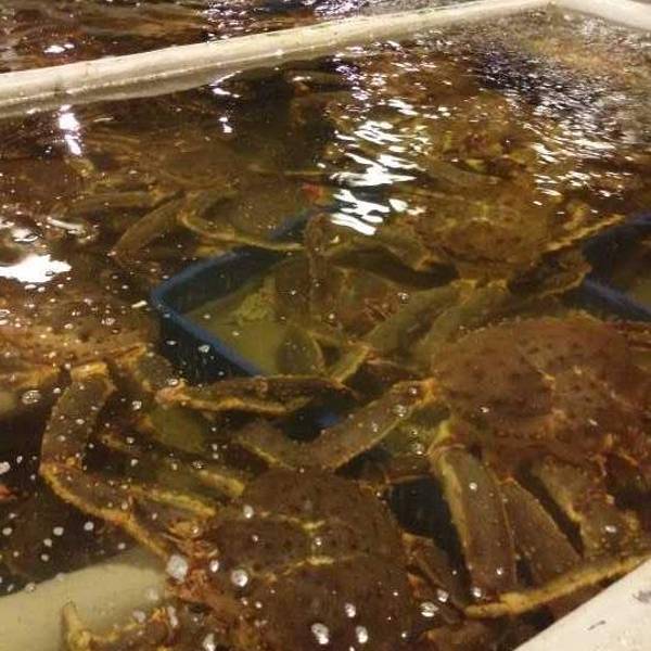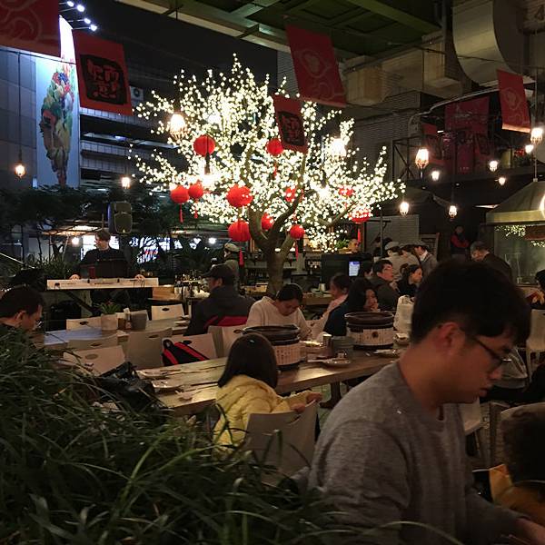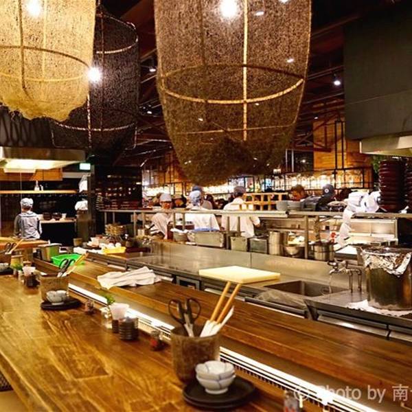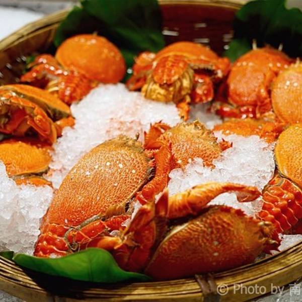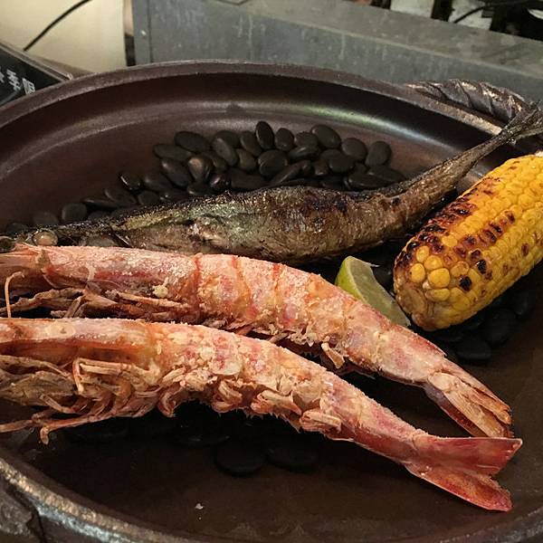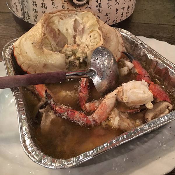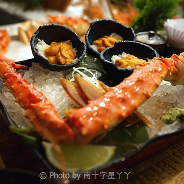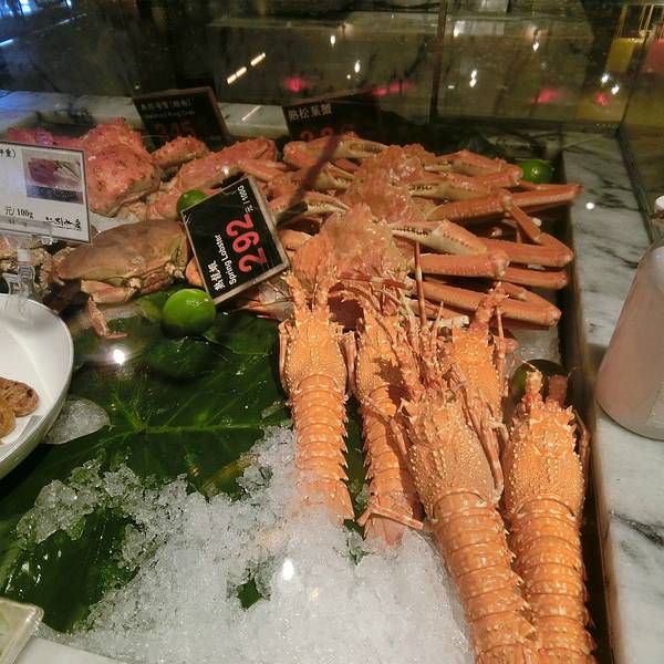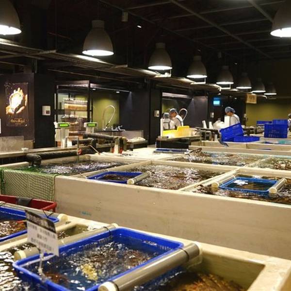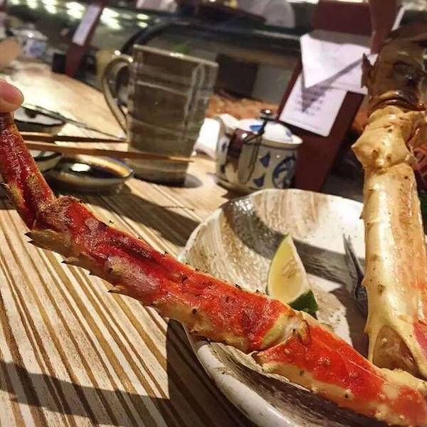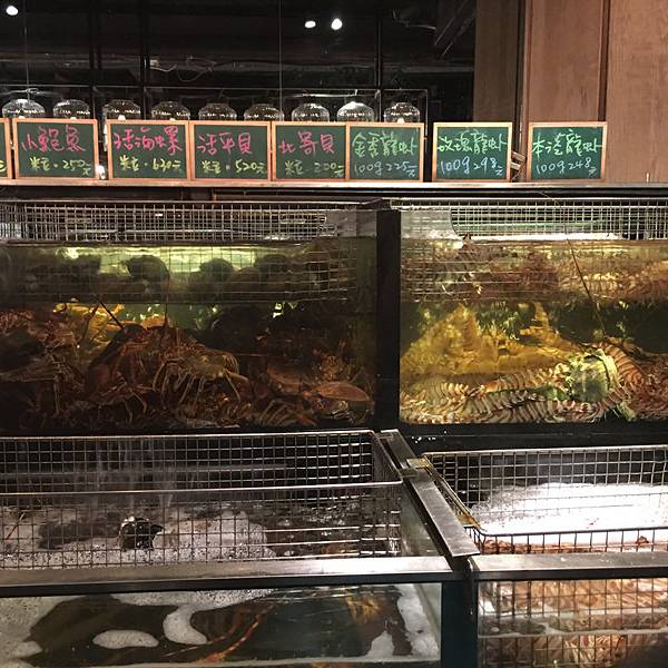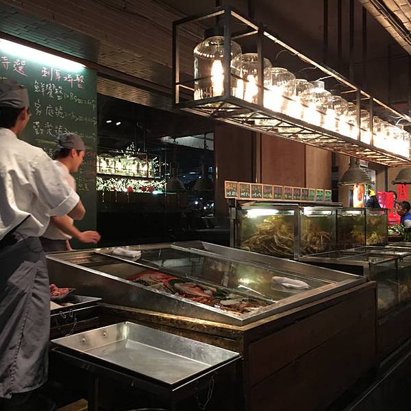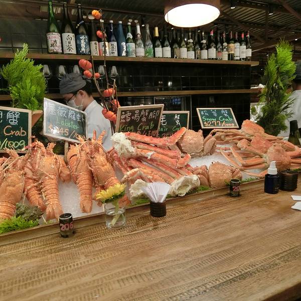 立吞区,里面卖的海鲜都是已经做好的,你可以点一些海鲜,再去吧台点一杯红酒,然后就可以站着享受你的海鲜了(对,就是站着)。因为较多的海鲜是我们接受无能的刺身做法,所以我们匆匆逛完就去了香喷喷的炭烤区。路过立吞区,就到了炭烤区,你会先路过一个生鲜市场,挑选你的海鲜,然后就可以去室外的炭烤区就排号坐了。还有个最受欢迎的蒸煮区,其实就是海鲜火锅,不过需要较长时间等位,好在这里不需要傻傻的站着排队,于是鸡智的领导给出了这样的策略:先在炭烤区吃,吃的同时,再去蒸煮区拿个号,等炭烤区吃完估摸着蒸煮区也快排到了,这样就两不耽误,咱领导的智商就是不一样。碳烤区的厨房大概就是这样的,烧烤可选的品种并不多。领导虽然有神一般的安排,但没有牛一样的四个胃,我们就这么阵亡在炭烤区。这家的炭烤蟹绝对是我吃过最鲜肥的,每一口都渗透着汤汁,写这句的时候,我重重的吞了口水,唯一美中不足的是,上菜速度实在太慢!最后,蒸煮区我们没去,因为也轮不上我们吃,吃完炭烤发现蒸煮区的位置还没排到.....