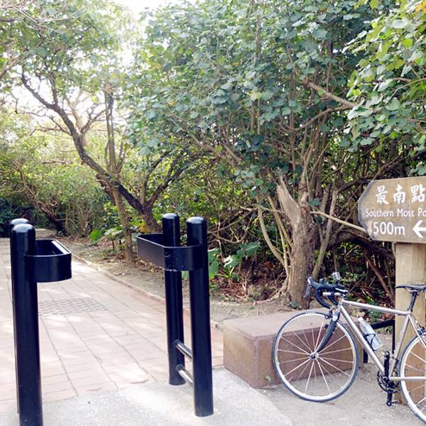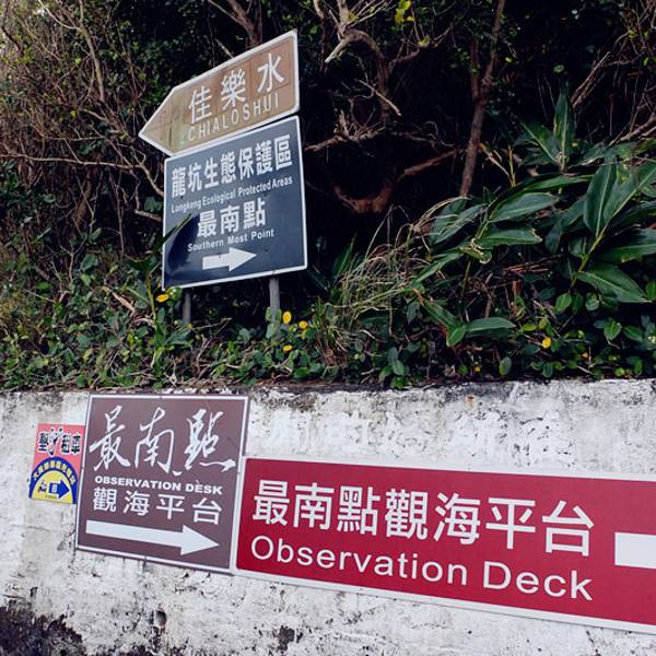 接下就去国境之南,这个景点非常小,路牌叫做最南点观海平台,一个非常不起眼的小道进去,毫无商业气息,简直很大陆的景点没法比啊!路途一个气象观测站,当然这个时间段终点也被大陆游客包围了,于是我决定第二天一早再来看看!暂且先留影几张! 沿著台26号至鹅銮鼻公园前左转往龙坑方向,上斜坡右转进龙坑,沿路直行到底就是鹅銮鼻露营区,从这里开始需要步行;沿著铺著砖块的林荫小径步行约十分钟,可看见一高台,高台上就是台湾最南点的意象标志了。 最南点经纬度东经120度50分0秒,北纬21度53分59秒,由平台望出去可看到太平洋与巴士海峡的交界处,由於洋流的影响,时常是波涛汹涌,惊涛骇浪,放眼远眺,周围皆是海天一色望不到尽头的壮阔景像,让人胸怀激昂,顿生人为沧海一粟之慨。