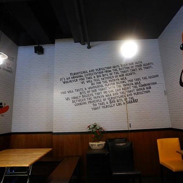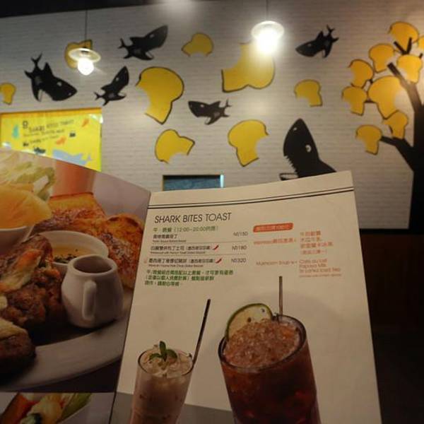 半路被这家店的招牌吸引住了,遂决定在里面解决午饭。 店名叫“SHARK BITES TOAST”——“鲨鱼咬吐司”。 后来发现在台湾各地也有多家分店。