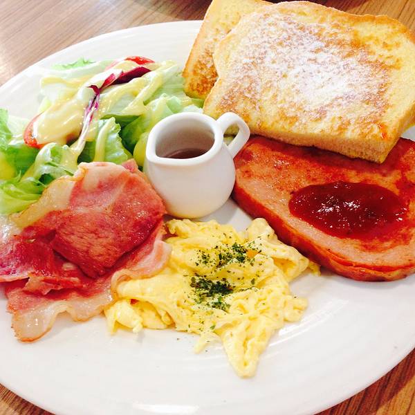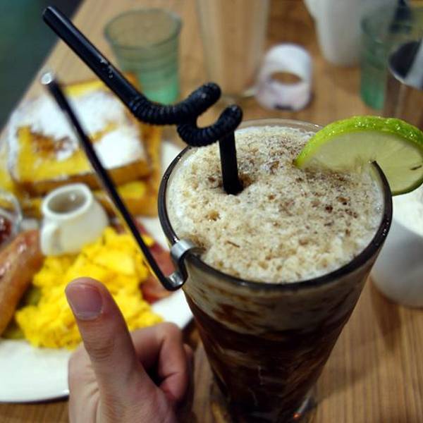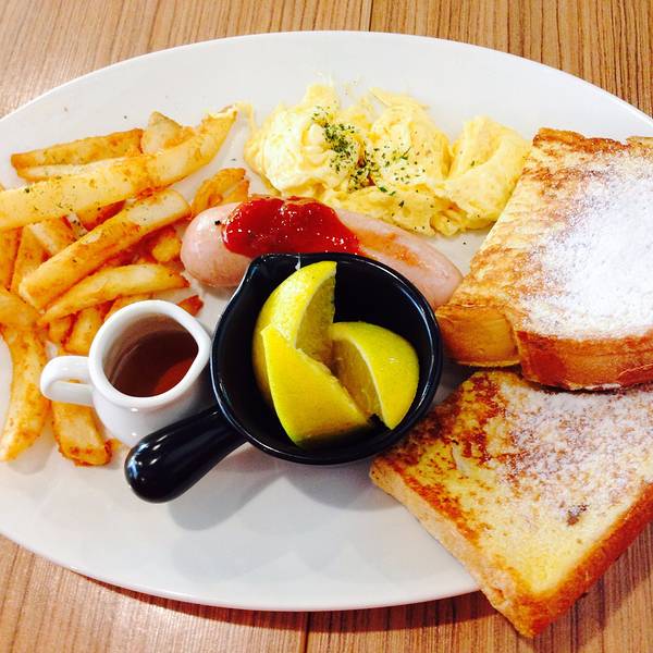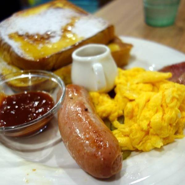 松饼 布丁土司 白肠双拼炒蛋布丁土司 午后欧蕾 墨西哥莎莎酱 辣 白肠 柠檬牛奶冰沙