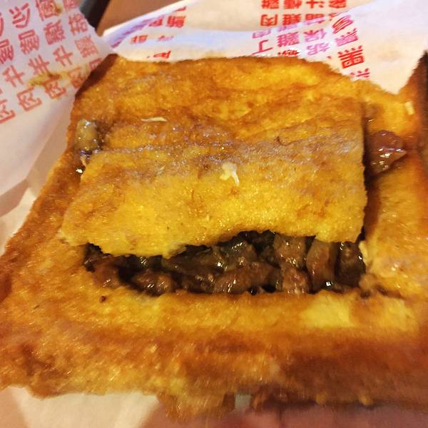 法式棺材板,是自强夜市里面唯二的棺材板之一,跟蒋家创意棺材板是差不多的,营业方式也是类似~~~买一份棺材板,配一杯饮料(可选奶茶or红茶) 我点了一份沙嗲牛肉棺材板,面包里的牛肉份量蛮足的,牛肉的味道也是一级棒,面包正好解了些许油腻,搭配挺不错的,跟以前吃的面包多士不一样的体验~~~