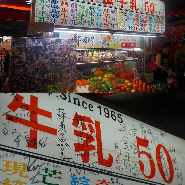 六合夜市"招牌 ”郑老牌木瓜牛奶" 听说很多名人来过,看招牌上的签字。 不过我发现,夜市上有好几家冒牌的,一定要擦亮眼睛看清楚,正宗的"郑老牌"靠近夜市的末端了。
