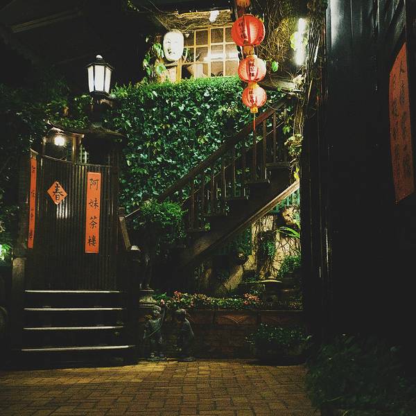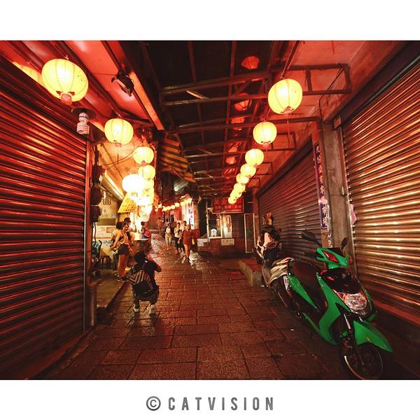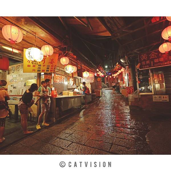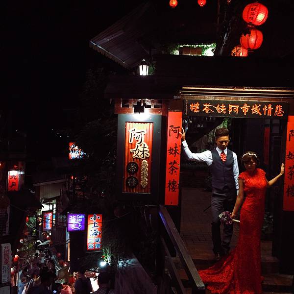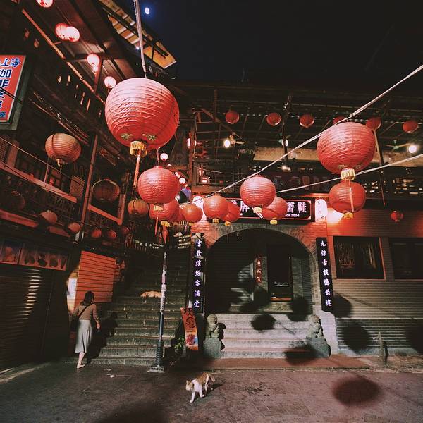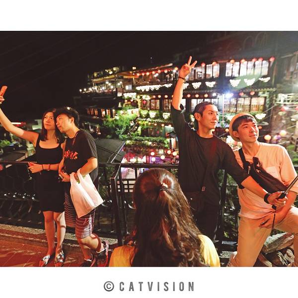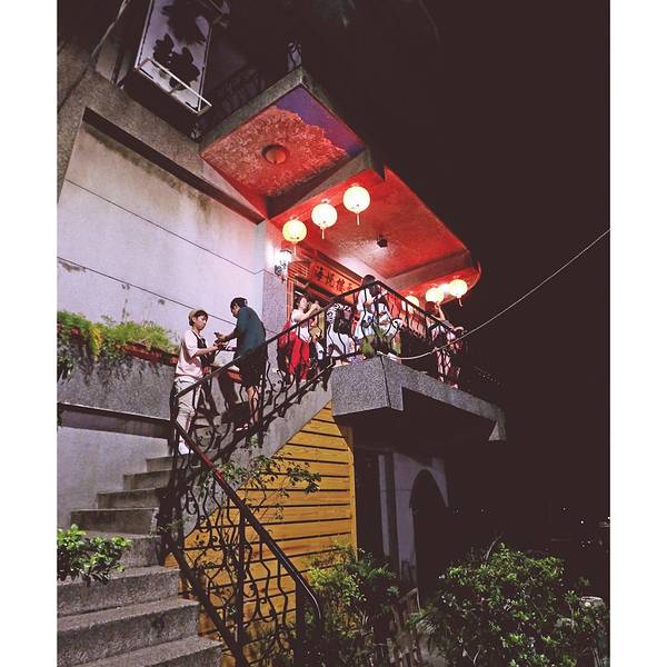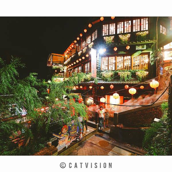 八点的九份,忽然安静了下来,游客陆续离开,店铺大多关门了,恢复了往日的宁静。不过阿妹茶楼这里还是人声鼎沸,谁让这里是九份的地标建筑呢~当年来九份都没好好逛过~这次总算看到了这热闹的场景。由于没带脚架,只能把相机搁在一旁的石柱上来了一张。后来发现对面这个茶楼才是拍摄阿妹茶楼的最佳取景位置,于是火速跑去,抢占有利地形。大家有序地排着队,等待着最佳机位~这两对cp拍的那叫一个起劲啊哈哈~你在拍风景的同时,不经意间也成为了别人眼中的风景~延绵不绝的小红灯笼与青石板路组成了最美的九份夜景,也让人想起了《千与千寻》中的不少场景。不知道这算不算在蹭《千寻》的热点呢哈哈~就在我们拍摄阿妹茶楼的时候,猫妈眼尖地看到了我们民宿的老板正在带着大家参观,于是我们与大部队汇合,跟着老板一起前往了许多九份的私房景点。