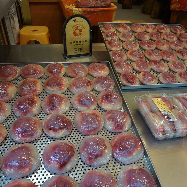 来到阿英红糟肉丸的店门口,眼睛接收到最多的讯息是:“粉红色!”一边是ㄧ颗颗刚蒸出来的肉丸,一边是半成品,颜色饱满的红糟肉就在上头。