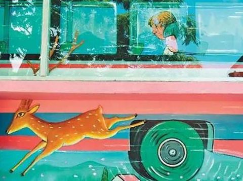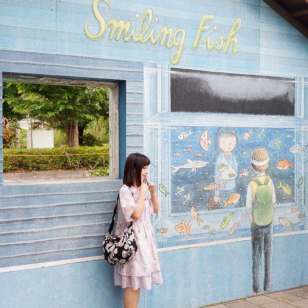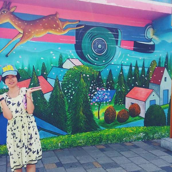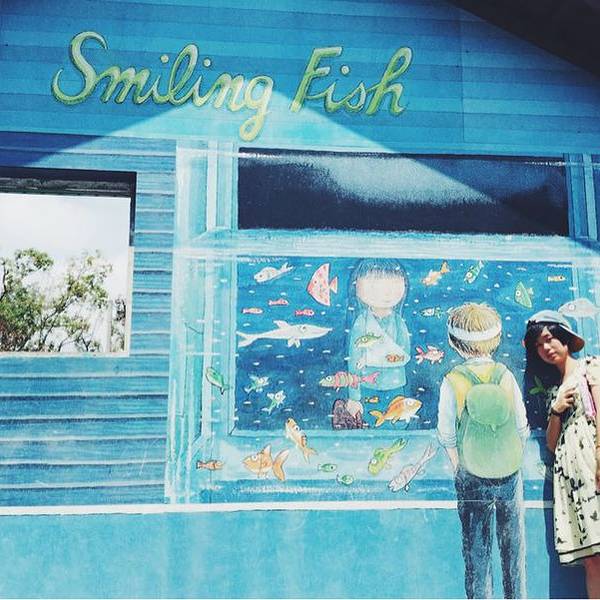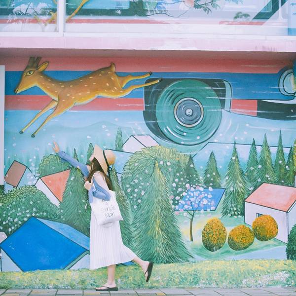 星空里的飞天公车、散落各地的行李箱、飞翔的鹿儿、微笑房子、向左走先生,向右走小姐,组合起来重现了好几个经典的绘本场景。牌子上刻着各种经典又治愈的对白:“不知道为什么,我总会在这里那里遇见他“、“人生总有许多巧合,两条平行线也可能会有交会的一天”、“秘密花开了”……老树绿荫《微笑的魚》彩绘墙↓ 天空中有麋鹿漫步,地上有就散落各角落的旅行箱。 展开