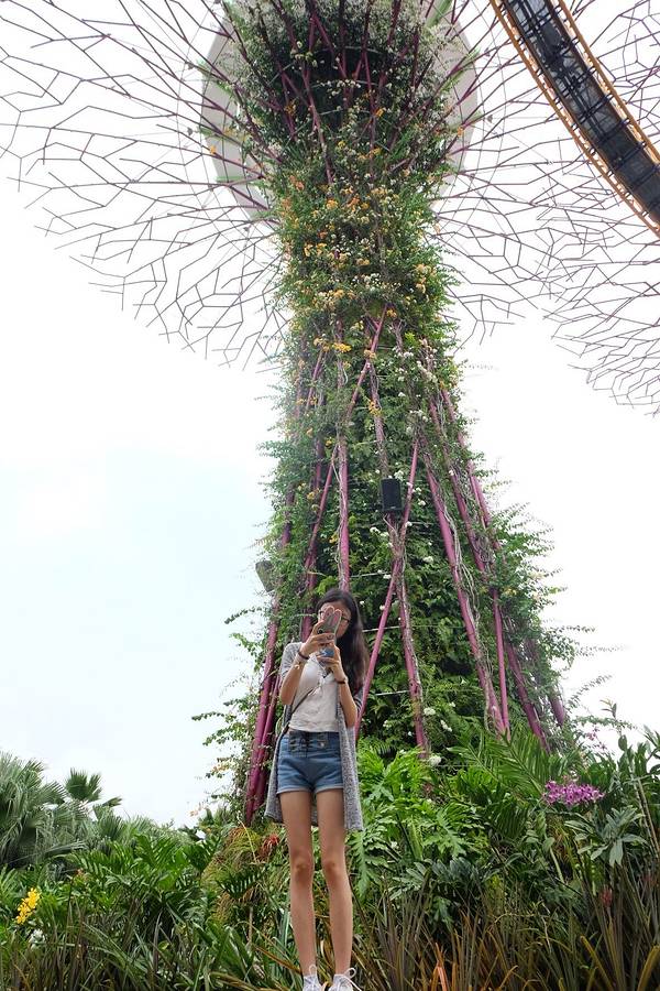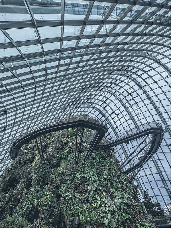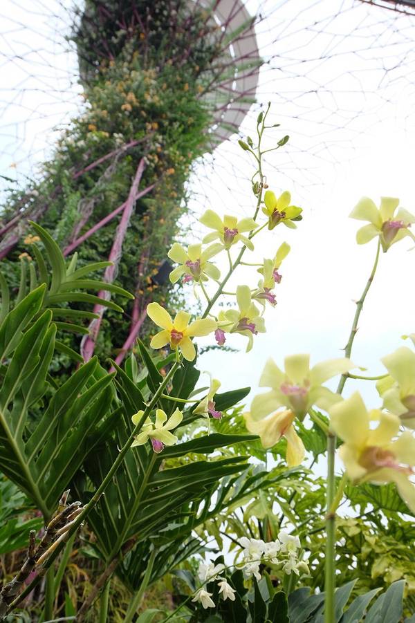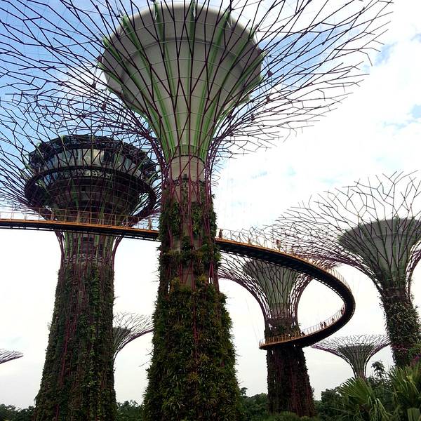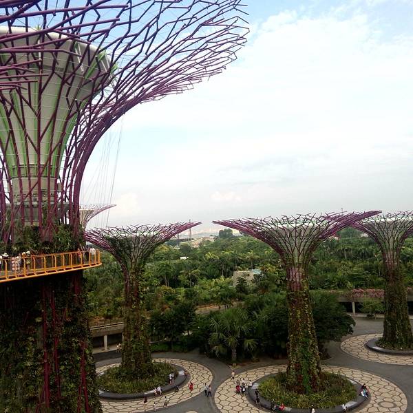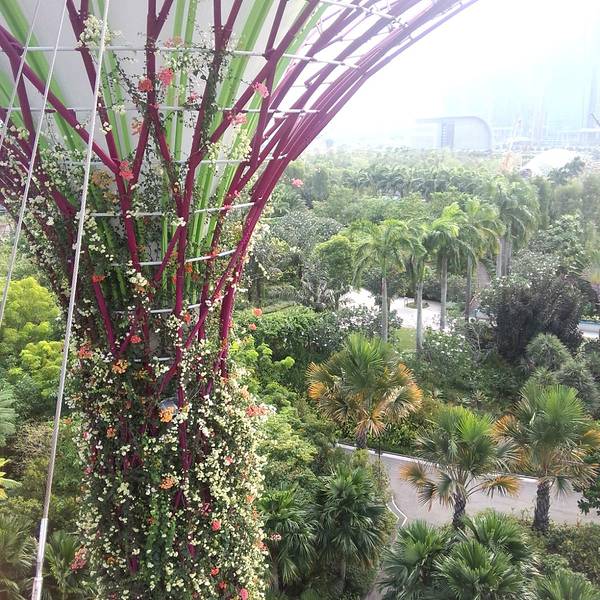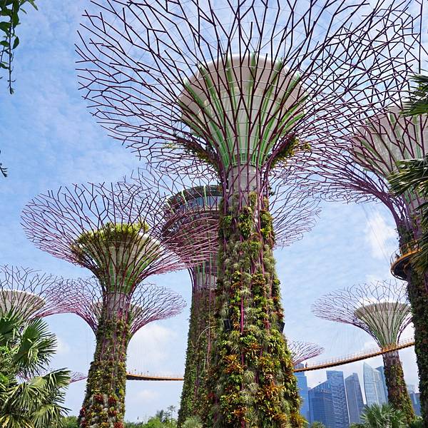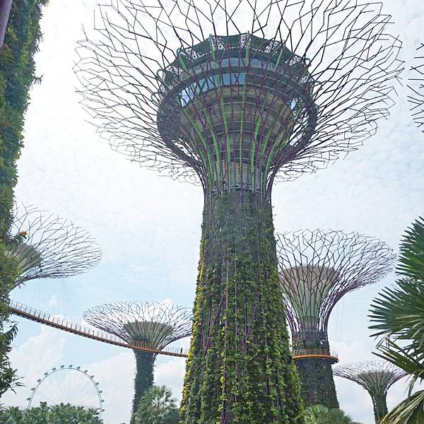 这里必须强力大力特别介绍的就是滨海湾的科技丛林Gardens By The Bay,里面有十八根擎天大树,他们的高度都介于25 至50 米的树形结构。上面展示有各类热带攀缘植物、附生植物和蕨类植物,树冠状的构造真的很让人惊叹。之所以被称为科技树是因为他们有自己的一套生态系统,擎天大树的部分“树冠”安装了光伏电池,可吸收太阳能,供夜间照明,其他“树冠”则与植物冷室系统相连,作为排气口。每两颗擎天大树之间有空中步道相连,方便游客行走。