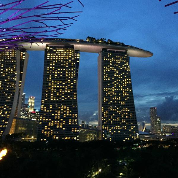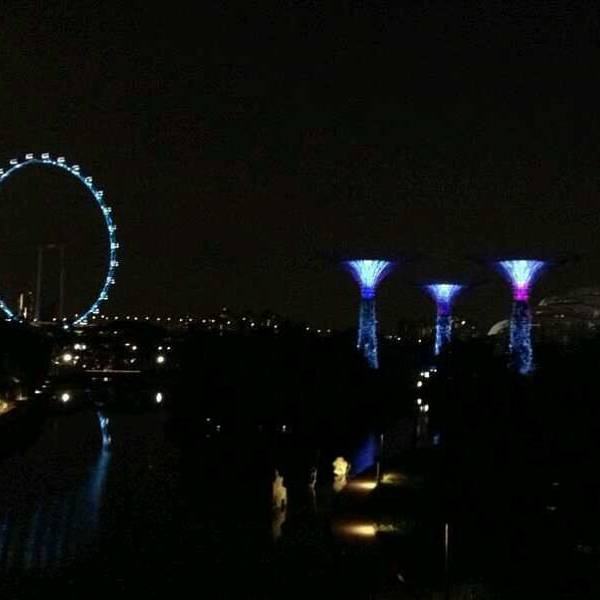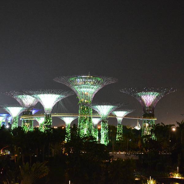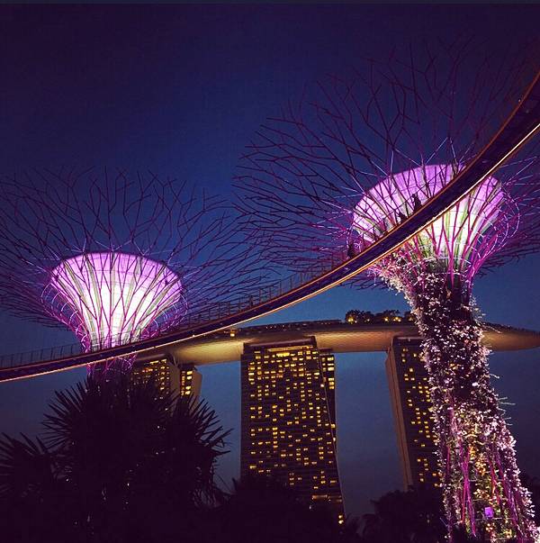 之后便要去到滨海花园属滨海南花园,其中建有多棵巨大的超级树,有趣的阿凡达树。无论是白天看还是晚上看都非常有趣。在晚上还有音乐灯光表演,一晚上有两场。夜晚的超级树是很漂亮的,灯光闪烁,璀璨迷人。此时,上到空中廊桥是最好的,不但能够近距离看到树木的夜景,还能够从最好的角度拍摄金沙酒店的背面。