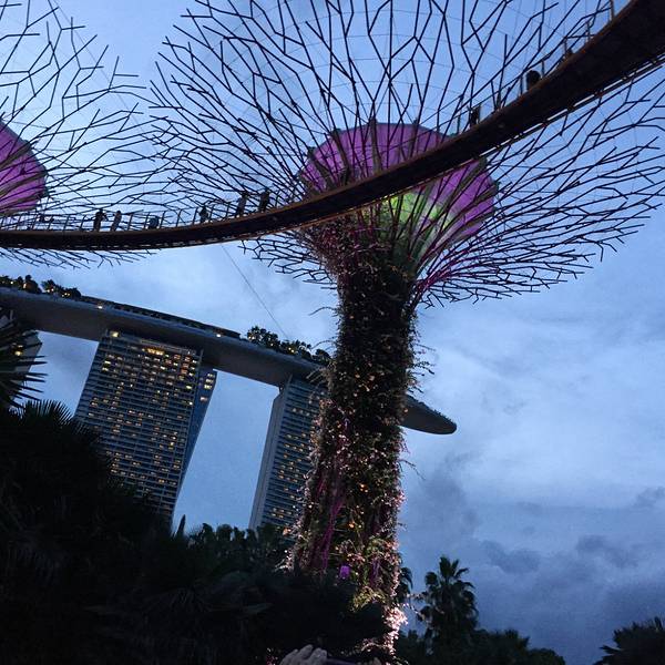 金骆驼 因为两个植物温室价格不便宜,我和 男朋友也不是非常喜欢看植物,就没有买门票去看温室滨海湾花园是新加坡前年新开的旅游地标,也是城市绿化非常重要的一部分。因为两个植物温室价格不便宜,我和 男朋友也不是非常喜欢看植物,就没有买门票去看温室。我们是冲着超级大树和空中skyway去的。我们选择了...滨海湾花园是新加坡前年新开的旅游地标,也是城市绿化非常重要的一部分。因为两个植物温室价格不便宜,我和 男朋友也不是非常喜欢看植物,就没有买门票去看温室。我们是冲着超级大树和空中skyway去的。我们选择了下午5点多去到,近距离感受超级大树的壮观。OCBC Skyway要5新币,是离地大概五层楼高的空中步道,走到窄处还有点怕怕呢!这个高度是欣赏整个滨海湾花园和背后金沙的绝佳地,超级大树树干爬满藤蔓植物和各种植物,树冠构造很壮观!不过空中步道上不能停留太久,我们就是一直在拍照,被工作人员赶过好几次。下来后我们就沿路走去Satay By the Bay,经过印度花园、中国花园等,都一般般没啥特色。经过其中一个植物温室时进去纪念品店转了一圈,发现里面的纪念品好精美!好多都是压花的水晶工艺品,超级漂亮,如果价钱合适的话我肯定会买的。Satay By the Bay好偏远,我们在暴走三天后,真的是凭着意志力走过去的。Satay By the Bay有好多沙爹烧烤肉串,还有烤魔鬼鱼,味道很不错!吃完后快到8点了,因为我们想去金沙看灯光show,所以就一路狂奔回去,经过超级大树时非常惊喜地发现正在进行唯美浪漫的灯光show,每棵超级大树随着音乐的节奏不停变换灯光,真的超级唯美超级浪漫啊!我差点想跟男朋友说不如看这个吧,不看金沙灯光show了。不过后来还是稍微放慢了脚步边赶路边欣赏,还是朝着金沙奔去了。 展开