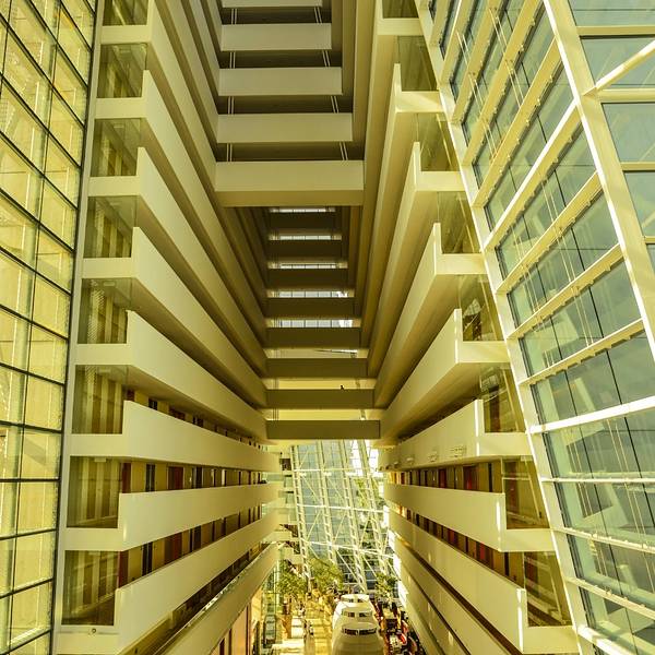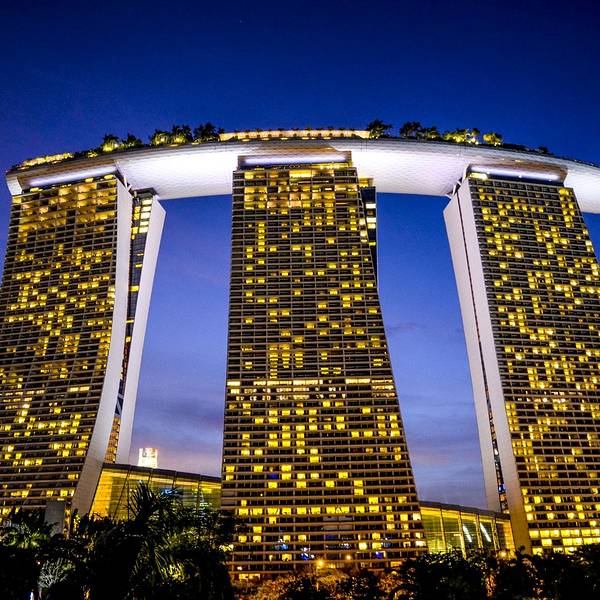 个人建议最好中午过后再去,大概两三点左右,按照我提供的线路,等返回时刚好是夜幕降临,可以拍到很多漂亮的夜景,具体路线和拍摄节点如下:首先,从Bayfront站里出来进去金沙酒店的裙楼大厅,从二楼穿过空中走廊,可以看到整个大厅的结构:穿过大厅就进入一个天桥,天桥的尽头就是花园的入口了。在天桥上可以看到大半个花园,非常漂亮。