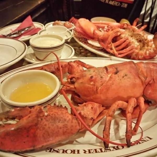 时间原因,安排在波士顿的行程非常的短,白天到剑桥区朝圣了麻省理工、MIT及哈佛之后,硬被小伙伴拖到波士顿大学玩了下谢娜的波士顿大学的梗,出来已是 天色渐暗 加之饥肠辘辘啦~ 吃什么好呢,小伙伴说:“来波士顿,当然是吃波士顿龙虾啦~”,于是翻看攻略 《孤独星球》提到 波士顿有家最古老的餐厅,是名人的最爱,就连肯尼迪也是座上之宾,还是常客来着~ 《穷游锦囊》更是说这家餐厅是美国历史上的第一家餐厅~ 时间问题,就不筛选了,就愉快的决定啦,就去这~ 蛤肉浓汤~ 雪白、醇厚、浓稠,每一勺都有不少蛤肉,新鲜甜美~ 波士顿龙虾,水煮的 趴着,烘烤的 仰着,相同的是 两只大钳子之间都放有一小碗热腾腾的黄油~ 龙虾肉蘸热黄油似乎是美国人的传统吃法,记得在旧金山的时候,旁边小情侣的龙虾也是这样子的~ 顺着切口将龙虾掰开,肉肉塞满虾壳,白肉与红壳之间满满的一条虾膏~ 用小叉子慢慢的把肉肉翘出来,蘸一下搭配的黄油,黄油与奶油的混合奶香环绕于虾肉之上,还未入口已是诱惑迷人~ 奶油香及淡淡的咸味之后,随着虾肉纤维的崩断,多汁的肉肉鲜甜瞬间爆发,丰满而香甜~ 而虾膏虾脑自不用在说,从来都无敌的存在~ 小伙伴的烘烤龙虾也是不错,虾肉塞爆口腔,肉肉扎实而又Q弹,虽少了多汁的爆发,但黄油的滋润之下,也是不遑多让~ 较之水煮,甜美稍差,但安放在虾肉的之上的酥香细末让其口感更为丰富~ 算是各有千秋吧~ 套餐里还有大袋蛤蜊~ 消灭之后,小伙伴满足的后靠到椅子上说:“老子 还是第一次吃龙虾给吃涨啦~”~
